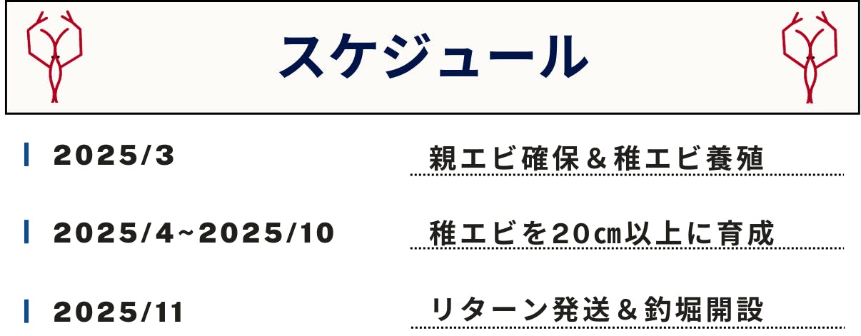資金は全て、新たに親エビを仕入れる費用、及び釣堀施設の費用に充てさせていただきます。