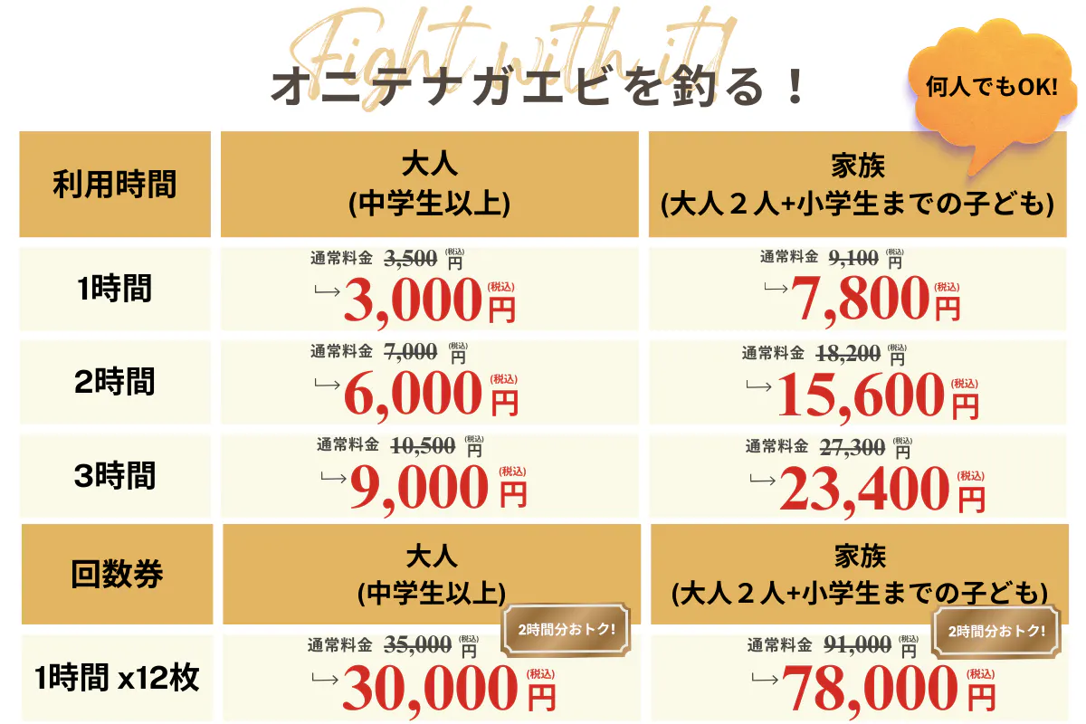 対象リターン:オニテナガエビ・ご家族(大人2名様+小学生以下のお子さま全員)1時間釣り放題チケット