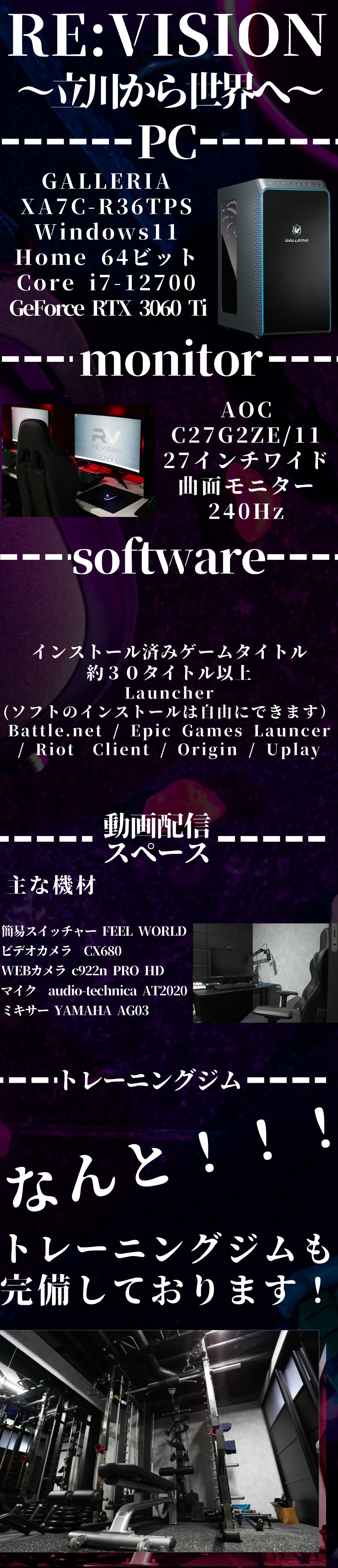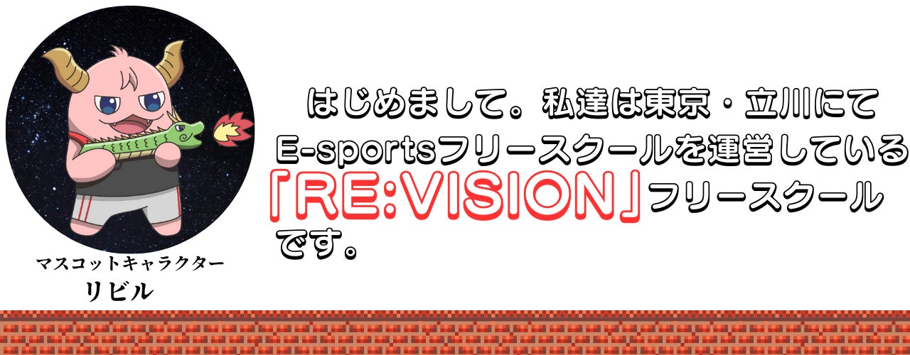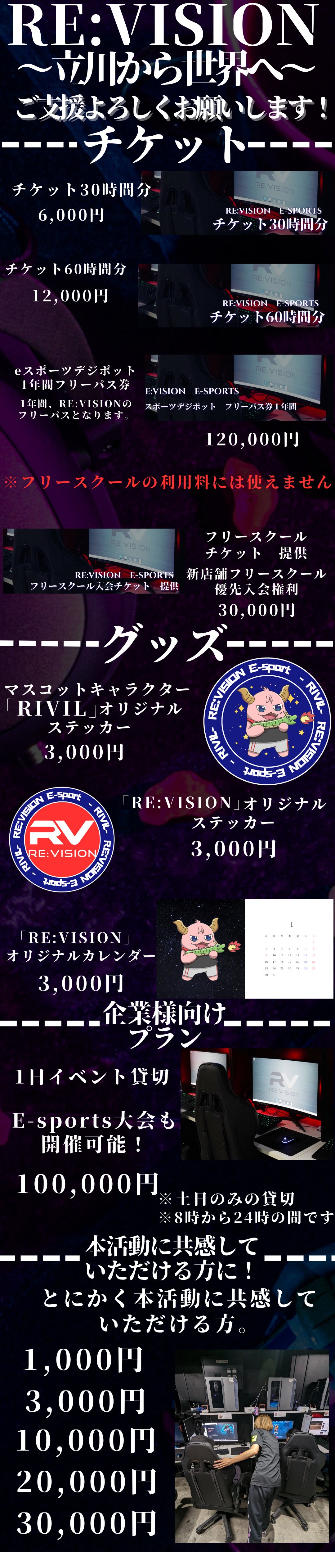 立川から世界へ!はゲームを通じて人として成長し、未来へ羽ばたいていく若者たちへのメッセージです。そして、店名のRE:VISIONはスポーツ(eスポーツ)のイメージを変えていきたい! 我々が持つ大きな使命と思っております。