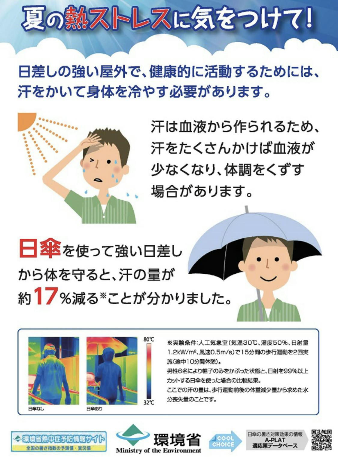 環境省も日傘を使用すれば、17%の発汗を抑えれて、血中濃度が上がらず熱ストレスに効果的と発表しておりますので、よりいろんな方々に使える方が良いですよね。