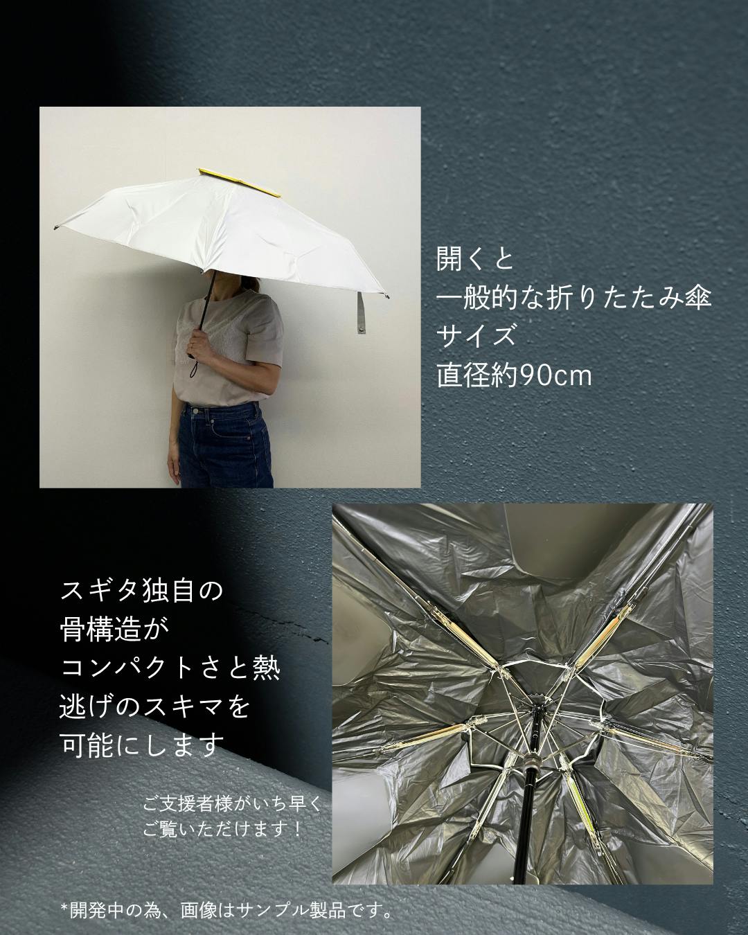 【折り畳まない折りたたみ傘】新しい傘骨の生産資金を皆様にご支援していただきたい。㈱スギタが意匠権取得済み=弊社独自の形の傘、新たなる試みです。骨の折りたたみ回数通常の半分!傘内部に滞っている熱を外に逃がし、暑さから避難する新しい熱中症対策日傘兼雨傘。新たなる試みをご支援ください。