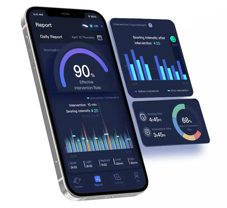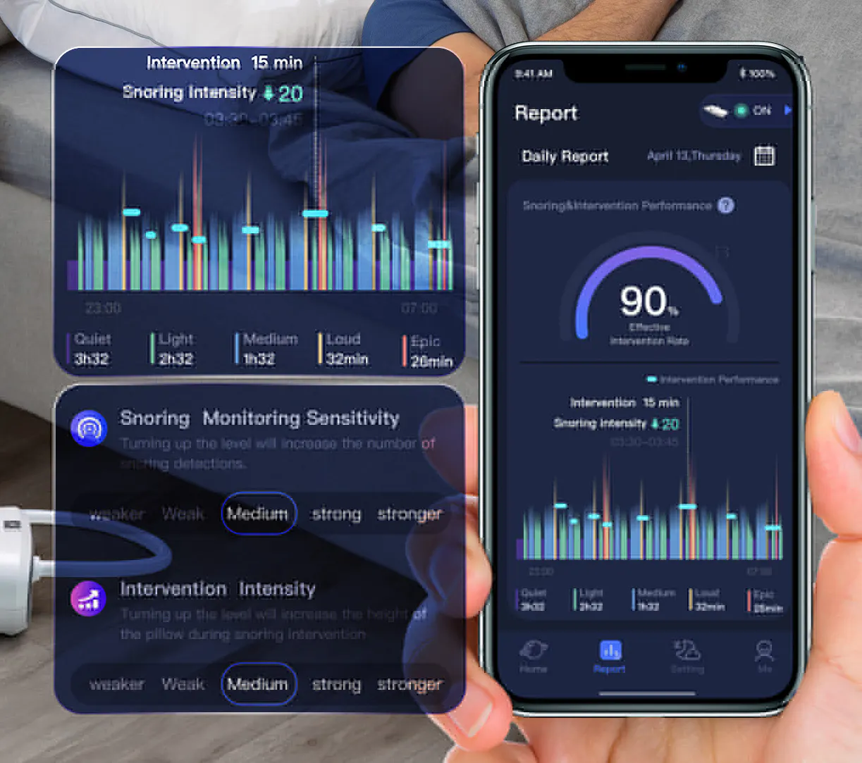 独自の集音センサーがいびきを素早く感知します。次に現在の頭の位置を検出し、一番効果的に気道確保できる頭の位置を割り出します。