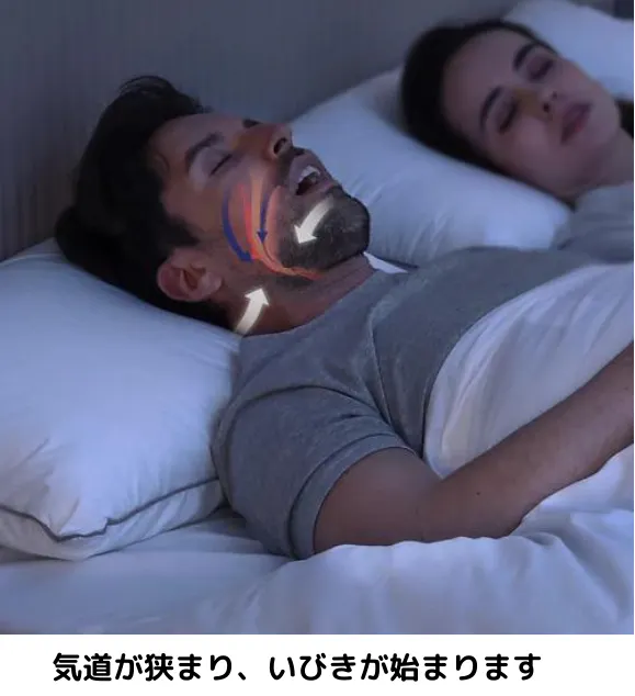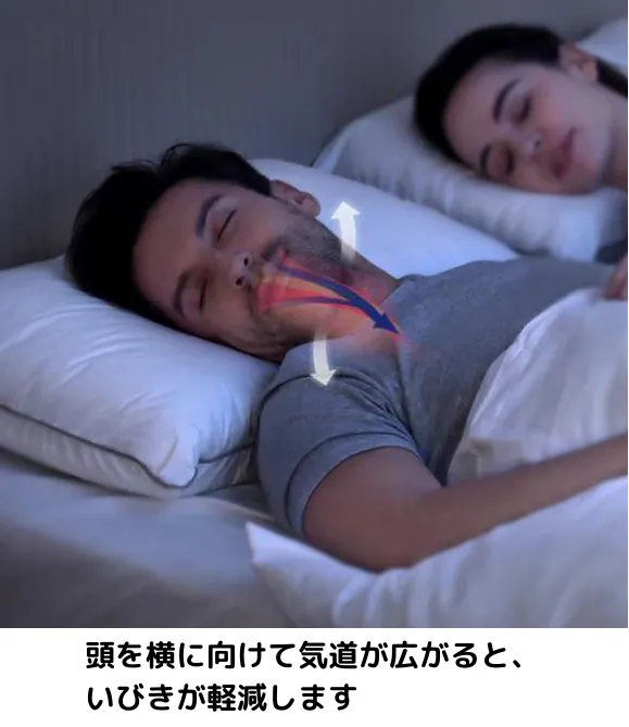 多くの場合いびきは、仰向けの時に気道が狭まることによって、気道全体が振動し引き起こされます。頭を横に傾けると、気道を広げることができ、いびきが軽減されます。