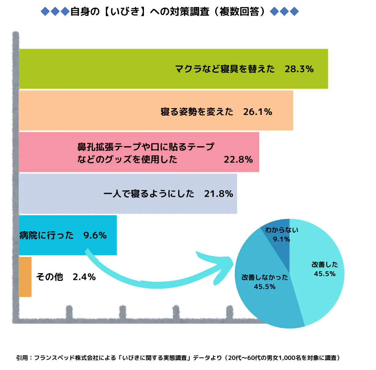 いびきの悩みを持ち、なんらかの対策の経験がある方は7割程度を占めていますが、解決した方は少ないようです。なぜならば・・・