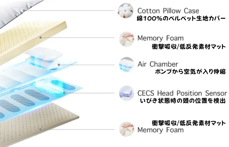 Z6マクラはいびきを感知すると、頭の向きを変えて気道を広げます。これは大量のデータをAIで解析し構築されたプログラムを基に、6つのエアバッグを調整して行われます。