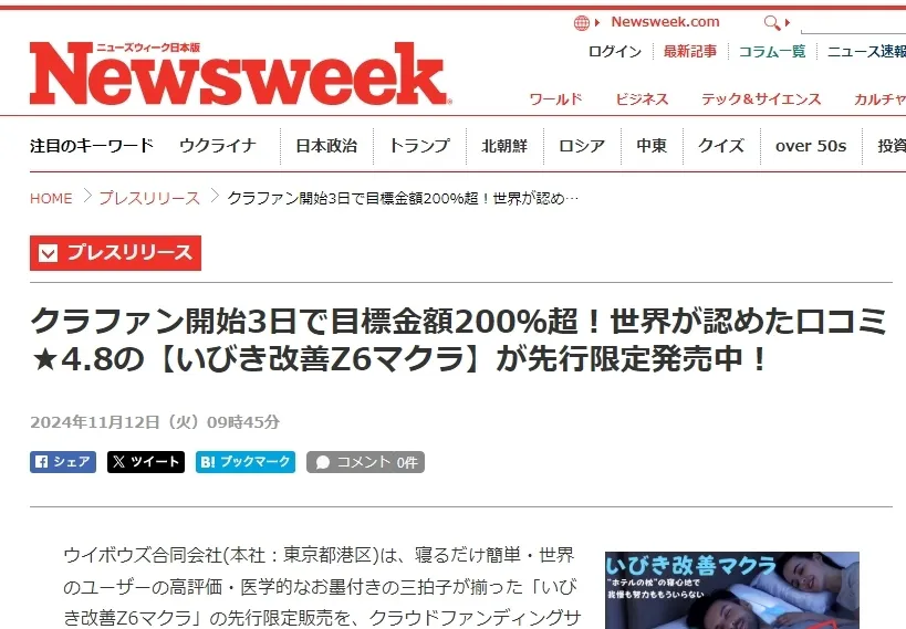 本日は、NEWSWEEKのWEB版でいびき改善Z6マクラが紹介された記事を紹介します。