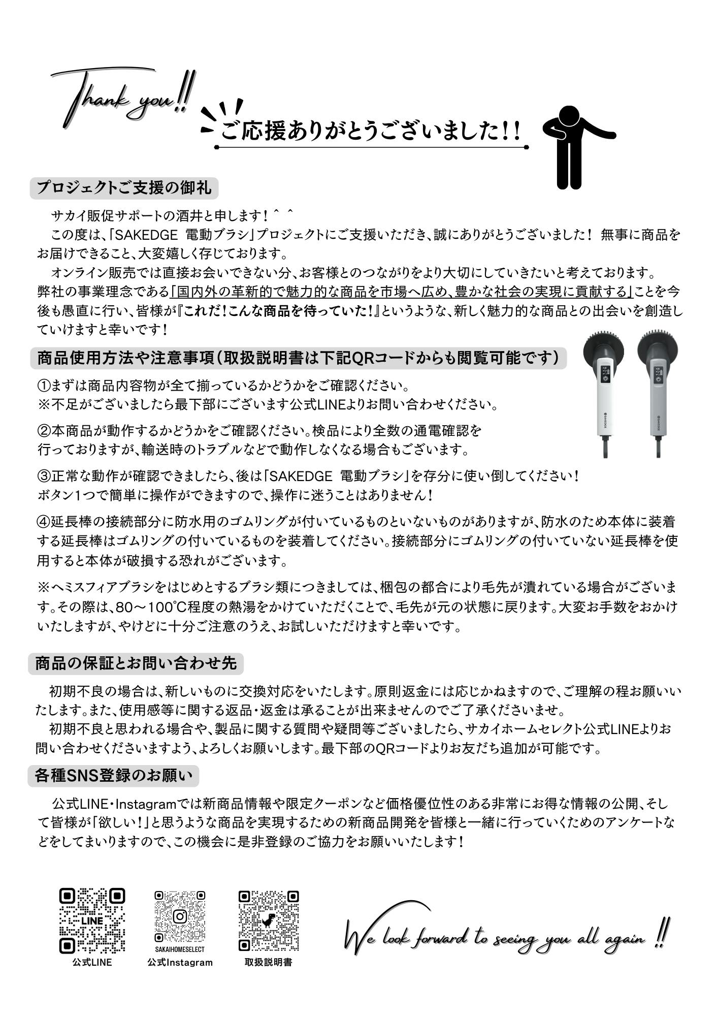 2025/05/15 15:03【SAKEDGE電動ブラシ プロジェクトご支援者の皆さまへ】お世話になっております!サカイ販促サポートの酒井です^^SAKEDGE電動ブラシをご支援いただいたご支援者の皆さま、大変お待たせいたしました!本日全ての梱包が終了し全てのサポーターの皆様へ商品発送を致します!配送業者は佐川急便となります。順次、皆様のお手元に届きますので暫くお待ちいただけますと幸いです^^地域によっては届くまでにお時間がかかってしまう可能性もございますのでご了承ください。何かご不明点やお困りの点がありましたら、お気軽に弊社公式LINEまでご連絡くださいませ■公式LINEhttps://lin.ee/TKeX3bQ取扱説明書に関しまして、皆さまがネットから簡単にご確認いただけるように、ダウンロード用の取扱説明書をご用意させていただきました!印刷してご利用いただくことも可能です!勿論、簡単ではございますが商品にも取扱説明書は同梱しておりますので、ご安心くださいませ。↓URLは以下の通りです。https://drive.google.com/file/d/1fkcCPHpK1J4e0oX_oxA8_PhxncgkmSu1/view?usp=drive_link※尚、ヘミスフィアブラシをはじめとするブラシ類につきましては、梱包の都合により毛先が潰れている場合がございます。その際は、80~100℃℃程度の熱湯をかけていただくことで、毛先が元の状態に戻ります。大変お手数をおかけいたしますが、やけどに十分ご注意のうえ、お試しいただけますと幸いです。公式ショップも是非ご覧ください!メルマガにて最新情報をお知らせしたり、SAKEDGEアイテムを広くご購入いただけるように準備を進めております。https://sakaihomeselect.com/最後になりますが、皆さまの手元に「SAKEDGE電動ブラシ」が無事に届き、お風呂掃除がラクになったり、その他さまざまな掃除が快適にできている姿を想像すると、非常に胸が熱くなる想いでございます...!!是非、知人やSNSなどで未だ本商品を知らない方へこんなに良い電動ブラシがあるんだということを是非お知らせいただけますと幸いです^^これからも『国内外の革新的で魅力的な商品を市場へ広め、豊かな社会の実現に貢献する』という事業理念のもと、益々尽力してまいります!今後とも温かいご支援とご愛顧を賜れますよう、心よりお願い申し上げます^^サカイ販促サポート 酒井 もっと見る