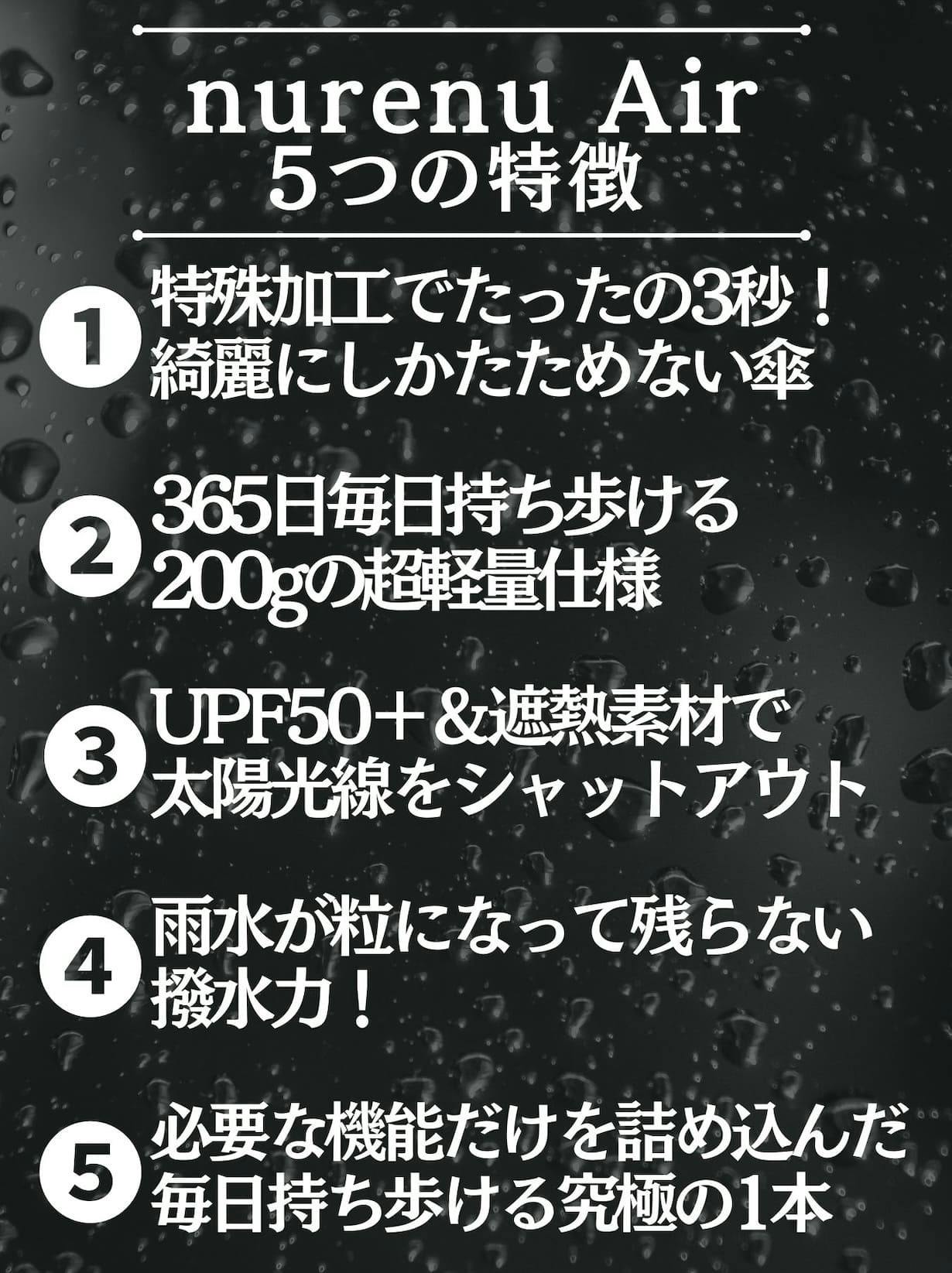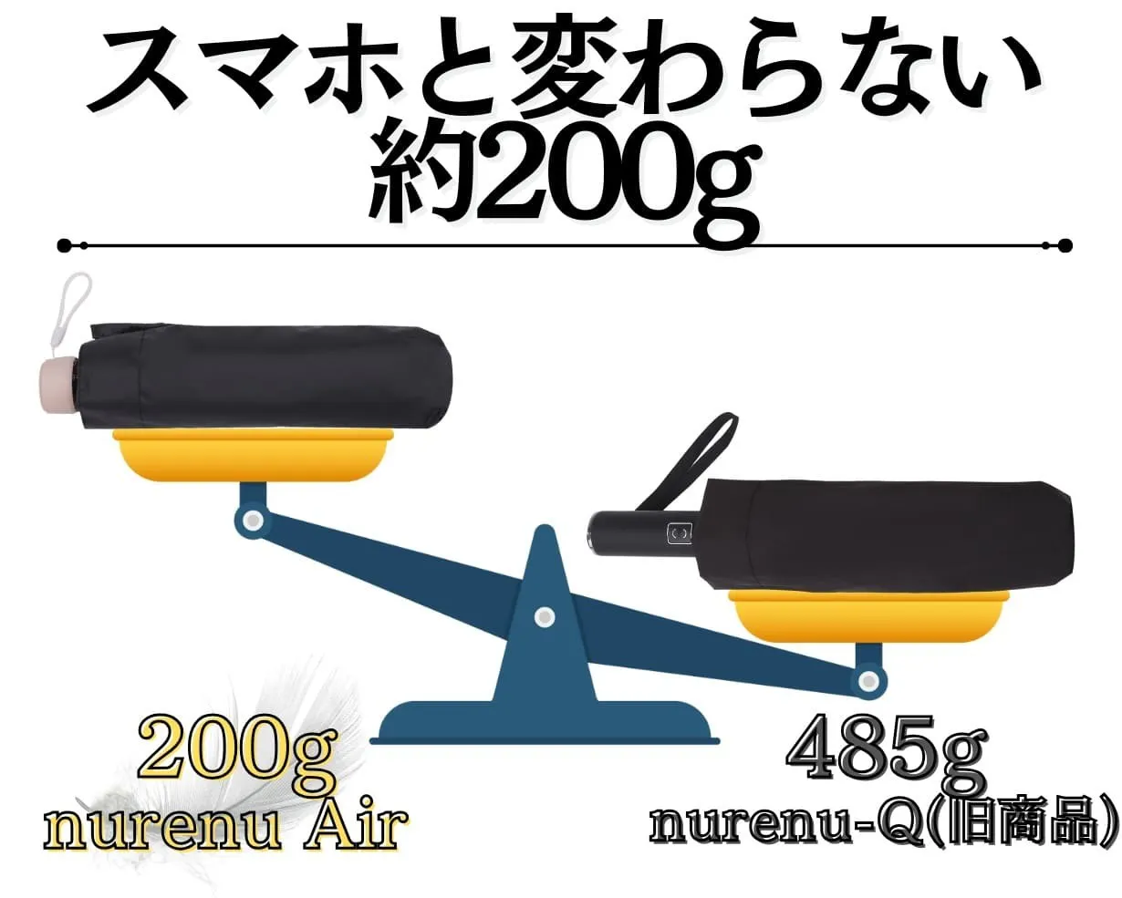 前回販売したnurenu-Qは高機能傘のためどうしても重さがあったものの、今回のnurenu Airは毎日持ち歩いても負担が少ないようスマホ程度の重さ約200gに59%軽量化しました!