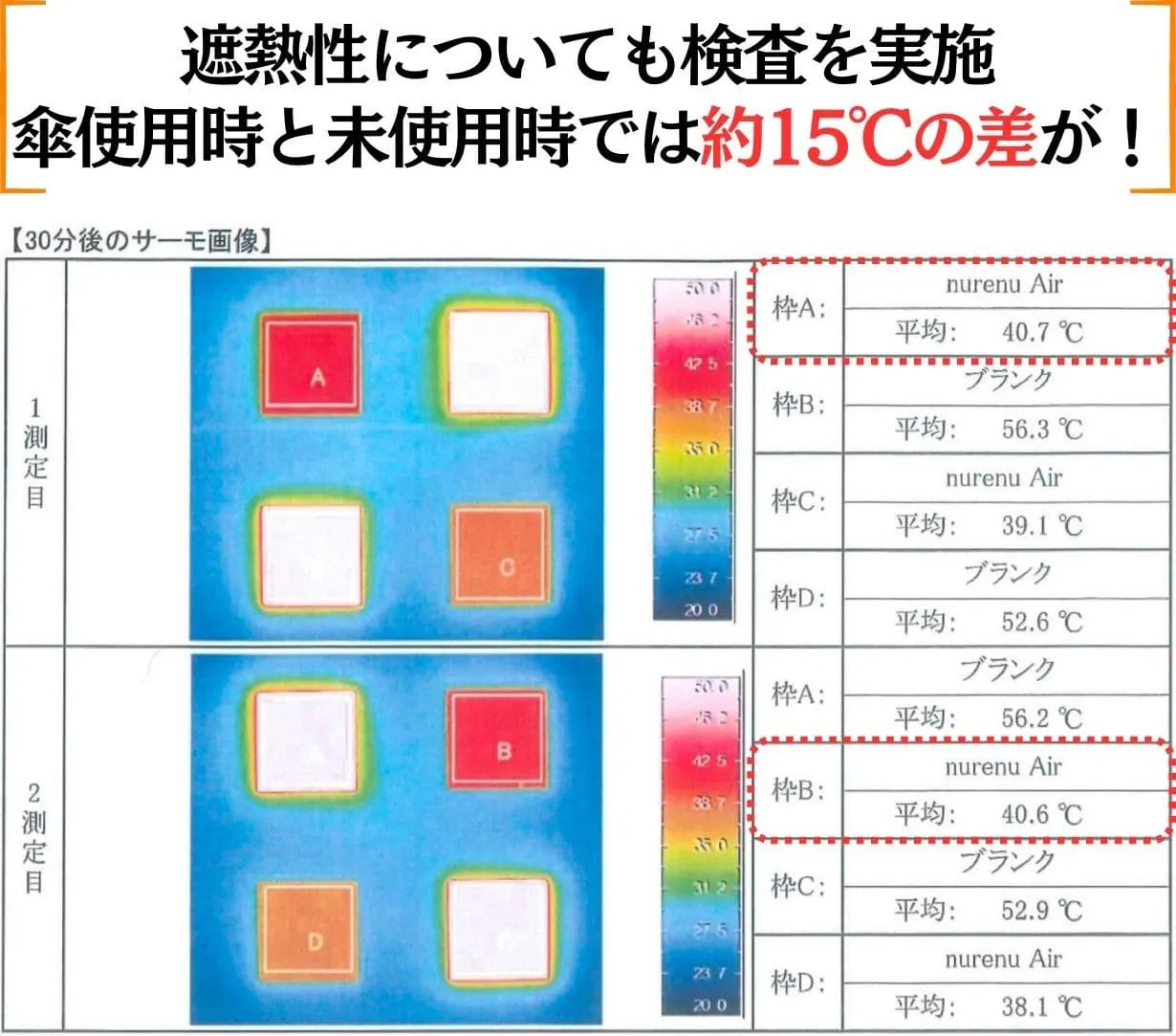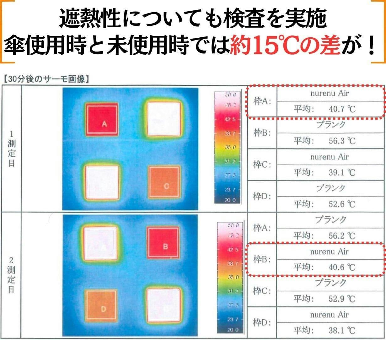 人工太陽光を用いて透過熱を測定し、30分後の温度差で遮熱率を算出。