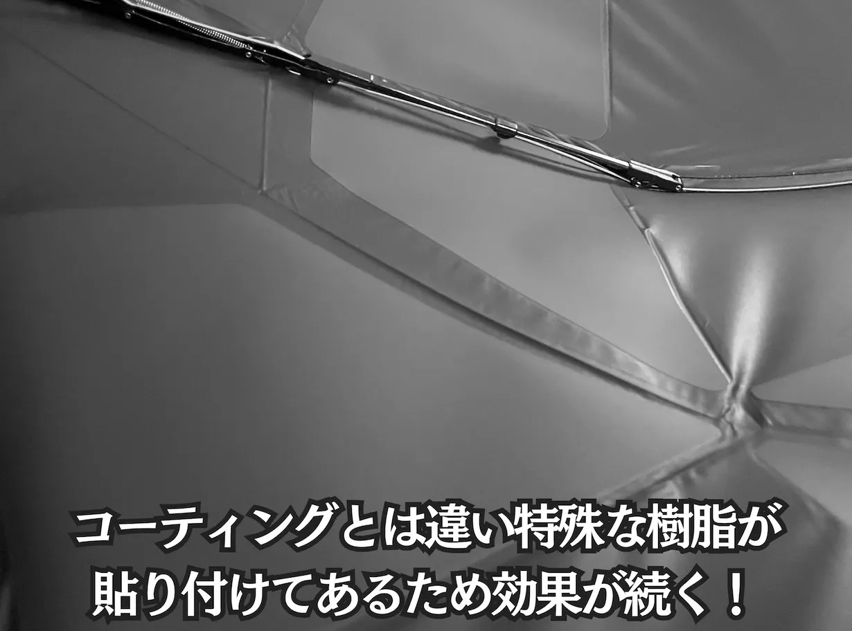 A : 傘の生地裏側の部分に薄いプラスチックのような樹脂をつけている状態のため、基本的には外れたりしない限り耐久性は続きます。
