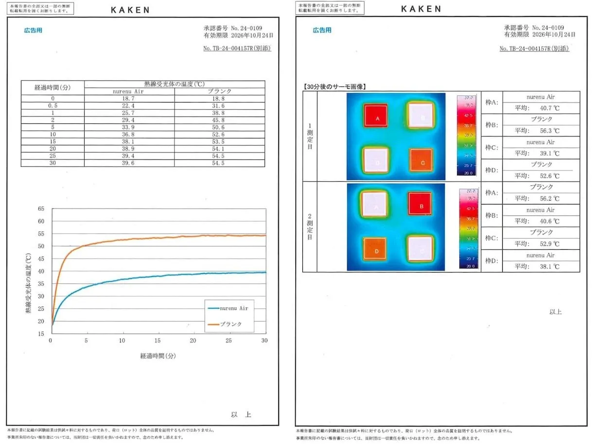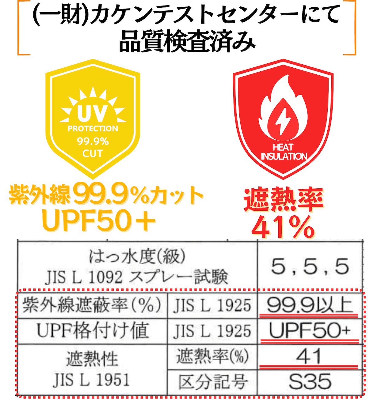 『紫外線遮蔽率(JIS L1925)』『はっ水度 (JIS L1092)』『遮熱性 (JIS L1951)』試験を実施