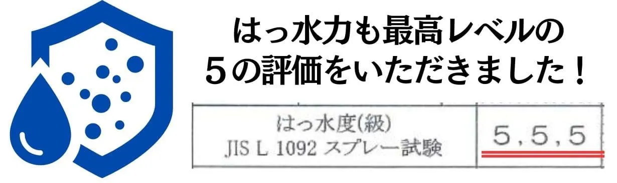 第三者機関である(一財)カケンテストセンターにてはっ水度検査を行いすべての検査において5段階中5の最高グレードの評価をいただきました!