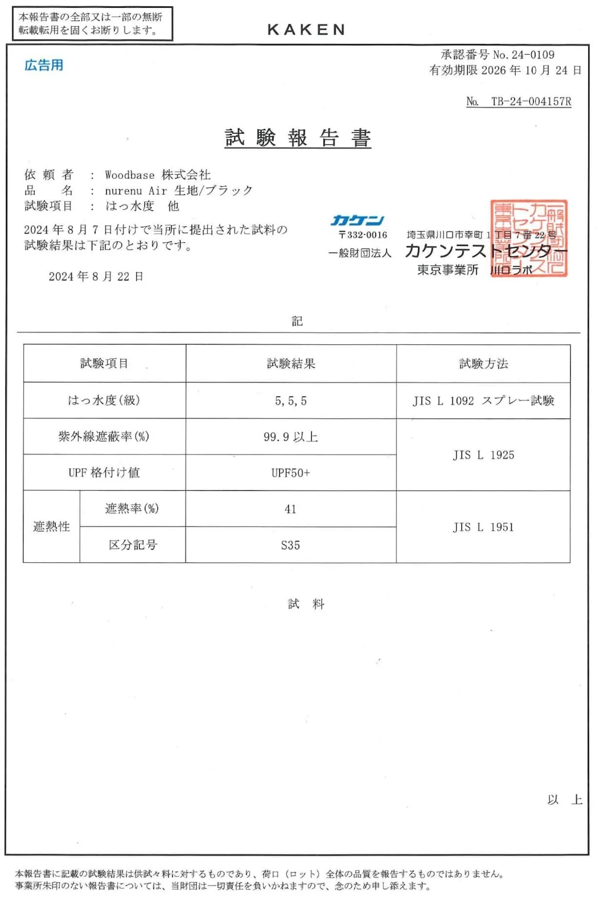下記が実際に第三者検査機関の(一財)カケンテストセンターにて発行されたのレポートです。