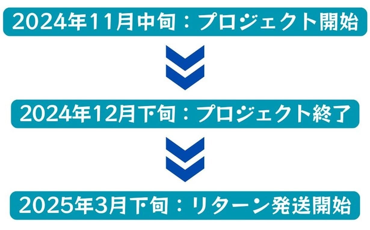 ※本文に記載しているスケジュールは、プロジェクト公開時点での予定です。クラウドファンディングの性質上、配送が遅れる可能性がございます。