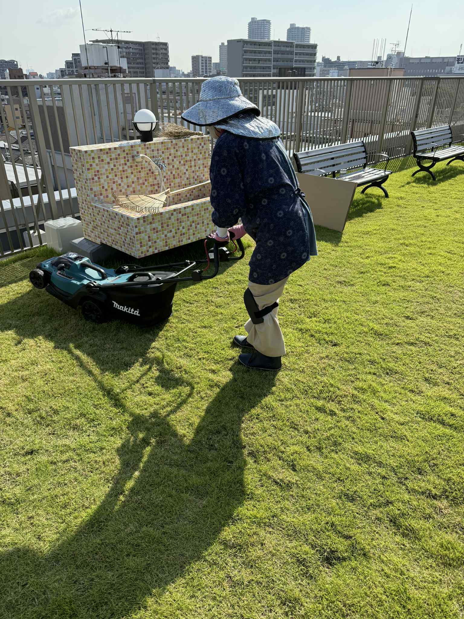 障害物が無いところは、きちぼうがマキタの電動芝刈り機で