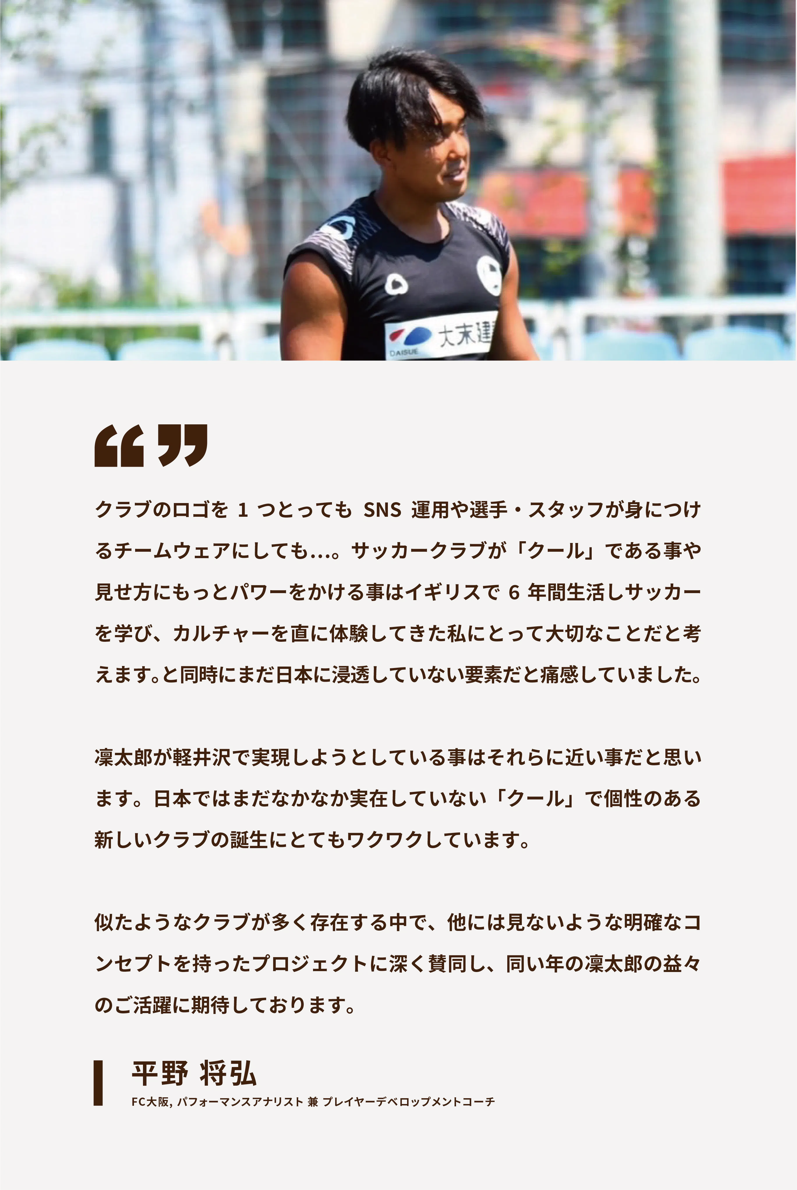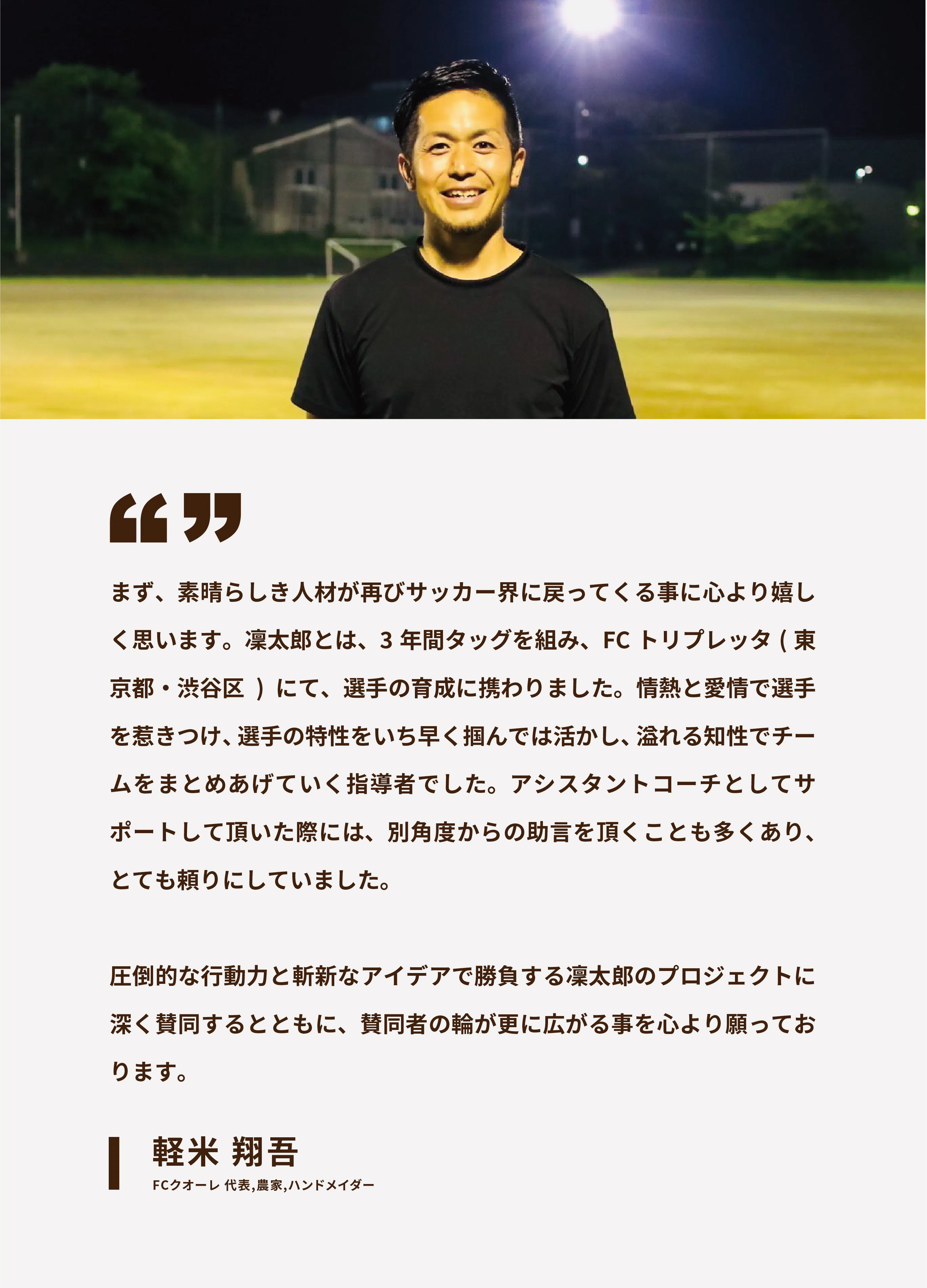 サッカー界にはサッカーに多くの犠牲を払い、大人になった時に「サッカー以外に好きな事を見つけられない。」と悩む人間が多くいます。しかし世界にはサッカー以外にも多くの素晴らしい事や物が存在します。単純にまだ知らないだけだと思うのです。だからこそ私はサッカークラブを通して「本当の自分を知るキッカケ」と「自己表現の機会」を創出したいのであります。