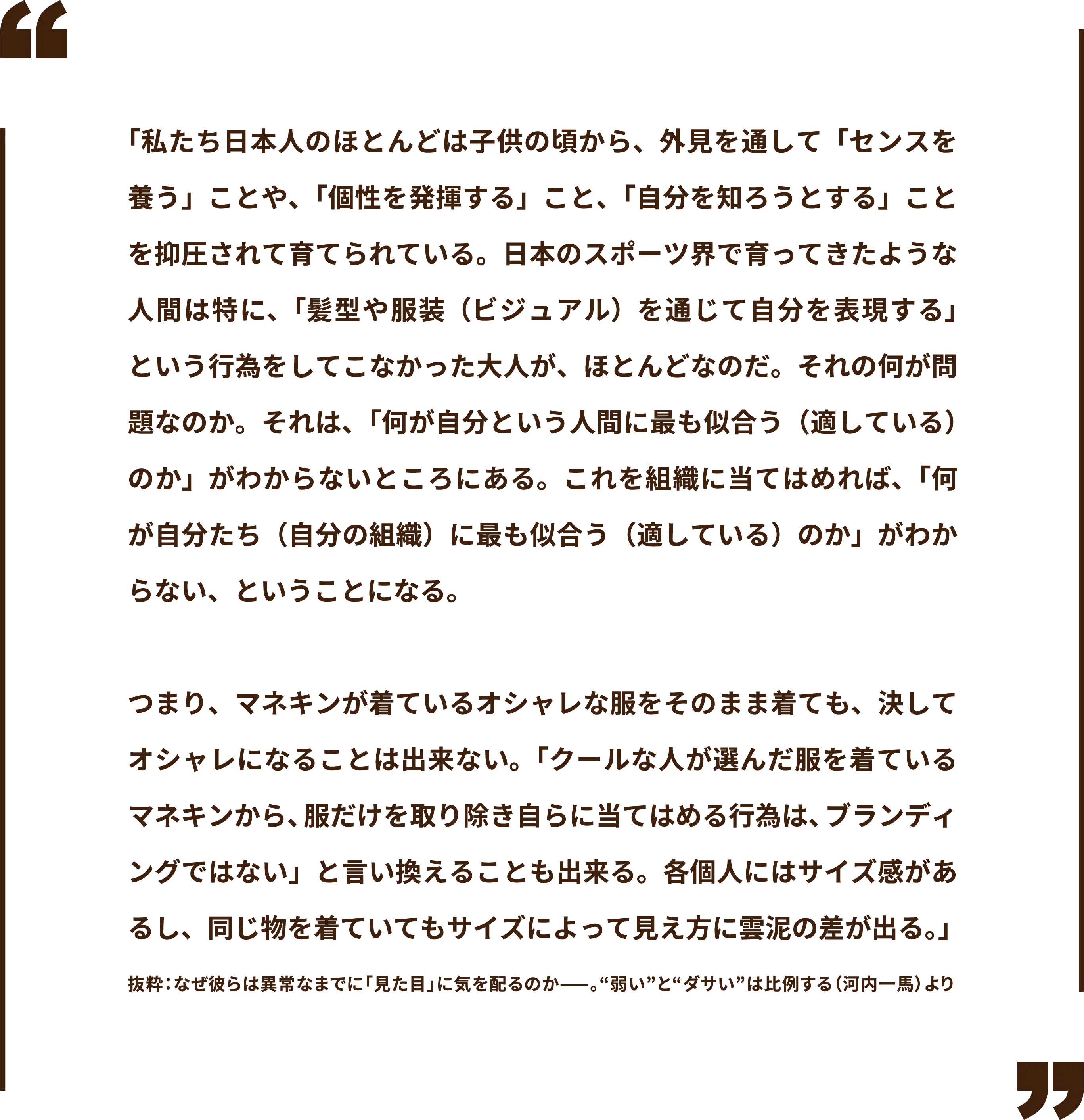日本のスポーツ界がなぜアメリカや欧州等の西洋の国々のスポーツに比べて、クールに見られないのか。それの根本は日本の教育段階にあると考えています。日本でサッカーをする場合、「サッカーだけ」に専念する事を求められ、サッカーに大きな犠牲を払わなければならない事が多く、日本の子供たちは「見た目」で表現する機会が限られている事が多いです。