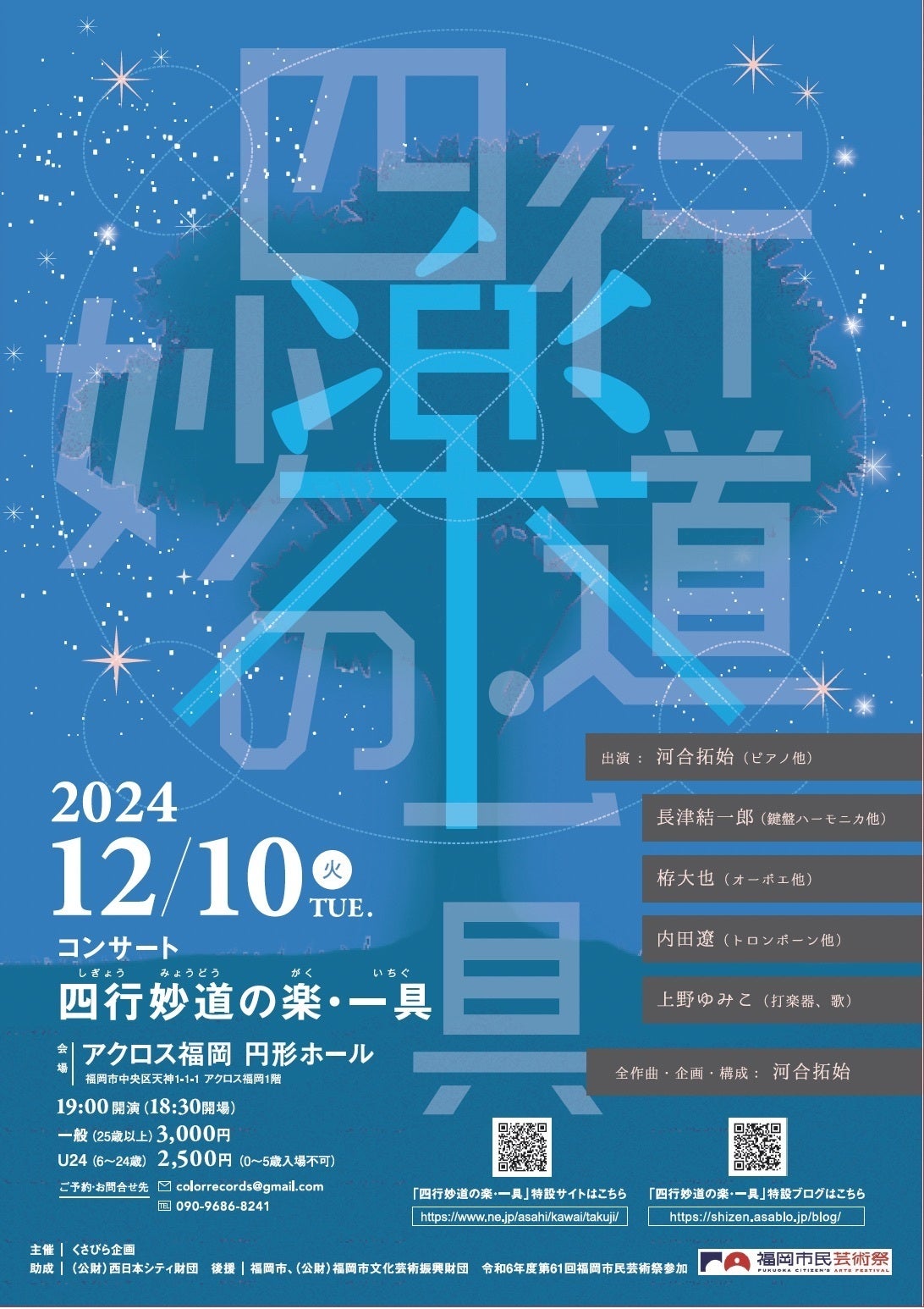 4年前に任意団体「くさびら企画」(旧名:クリスチャン・ウォルフの音楽コンサート実行委員会)を立ち上げ、2021年から毎年12月にアクロス福岡円形ホールでコンサートを行っています。毎回違ったテーマのもと、多様な背景を持つ出演者による企画を実現させています。現代音楽をベースにしつつも、親しみやすくクリエイティブなコンサートです。今年は12月10日に、「四行妙道の楽・一具」というタイトルで、5人の演奏家によるほぼ全曲新作初演のコンサートを開催します。