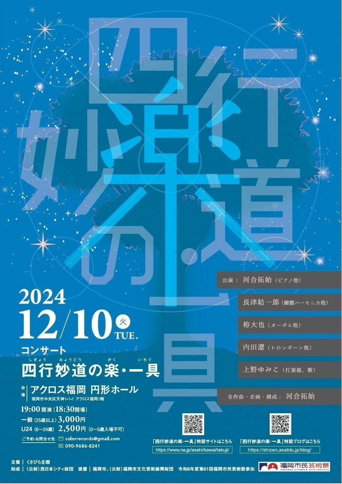 4年前に任意団体「くさびら企画」(旧名:クリスチャン・ウォルフの音楽コンサート実行委員会)を立ち上げ、2021年から毎年12月にアクロス福岡円形ホールでコンサートを行っています。毎回違ったテーマのもと、多様な背景を持つ出演者による企画を実現させています。現代音楽をベースにしつつも、親しみやすくクリエイティブなコンサートです。今年は12月10日に、「四行妙道の楽・一具」というタイトルで、5人の演奏家によるほぼ全曲新作初演のコンサートを開催します。