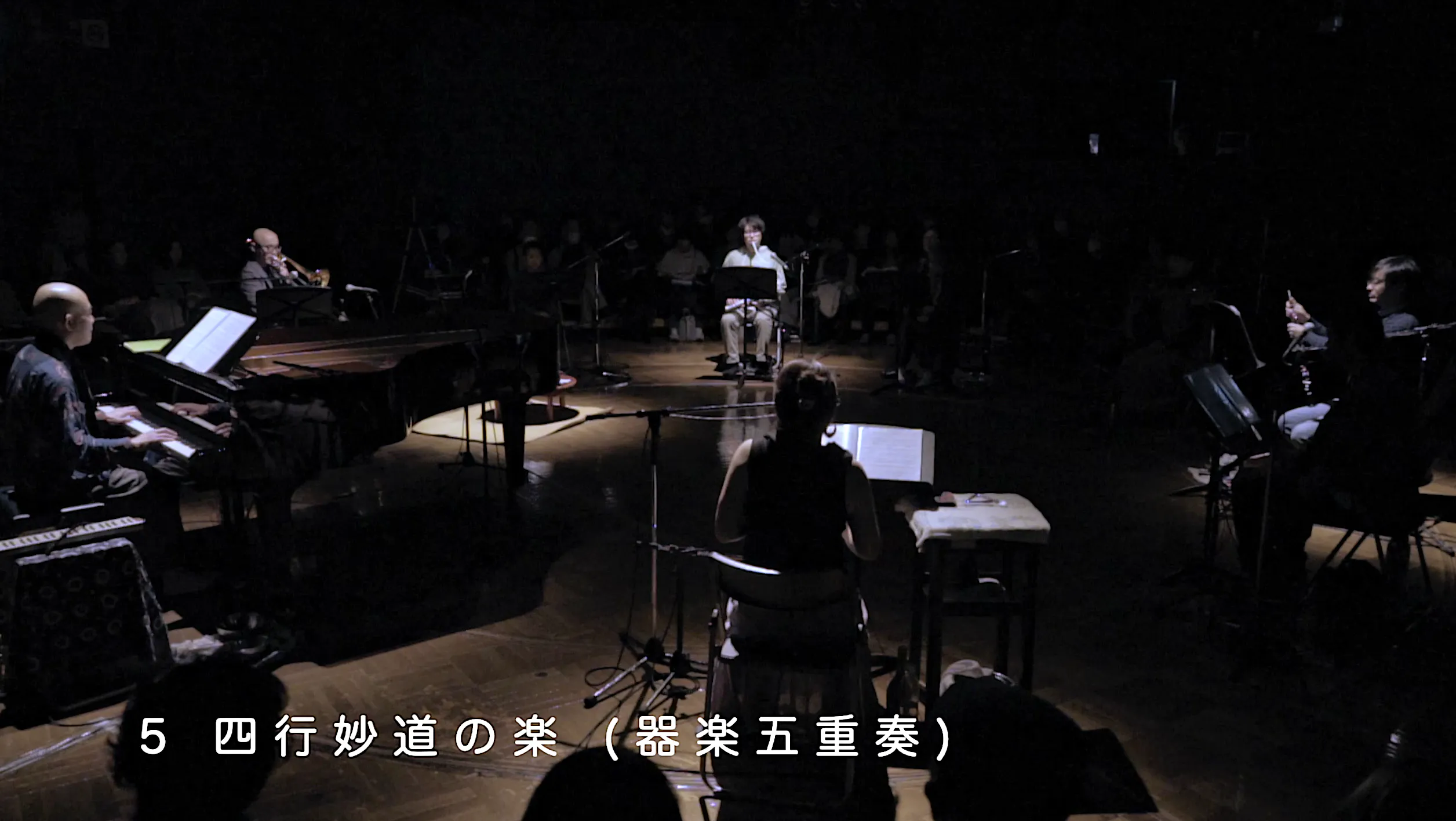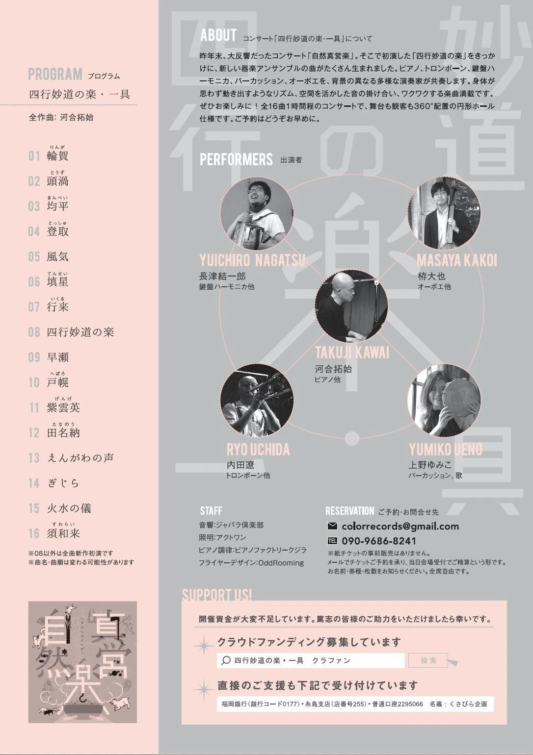 その時演奏した一曲「四行妙道の楽」は特に好評だったので、同じ編成(器楽五重奏)でもっと音楽を作りたくなり、たくさんの曲が出来ました。いわゆる現代音楽風というよりも、日本の伝統音楽や、他地域の民族音楽とも通じ、それでいてポップな親しみ易さもあり、意外にもリズミックでダンサブルとも言える曲も多くなりました。これまでにあまりないこうした音楽を、ぜひここ福岡で皆さんに届けたいという思いです。