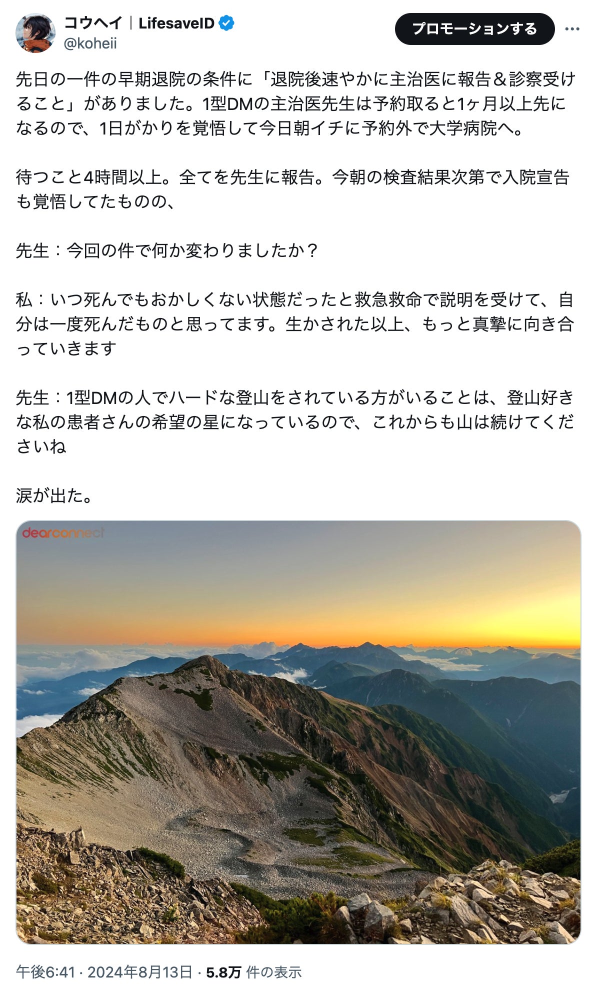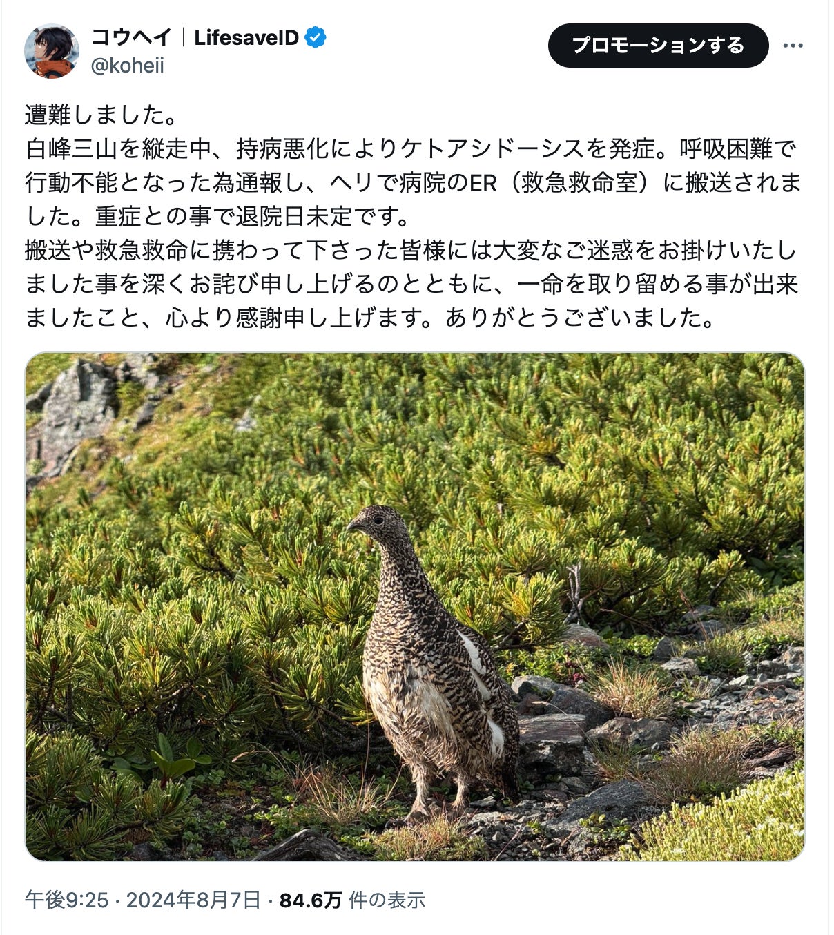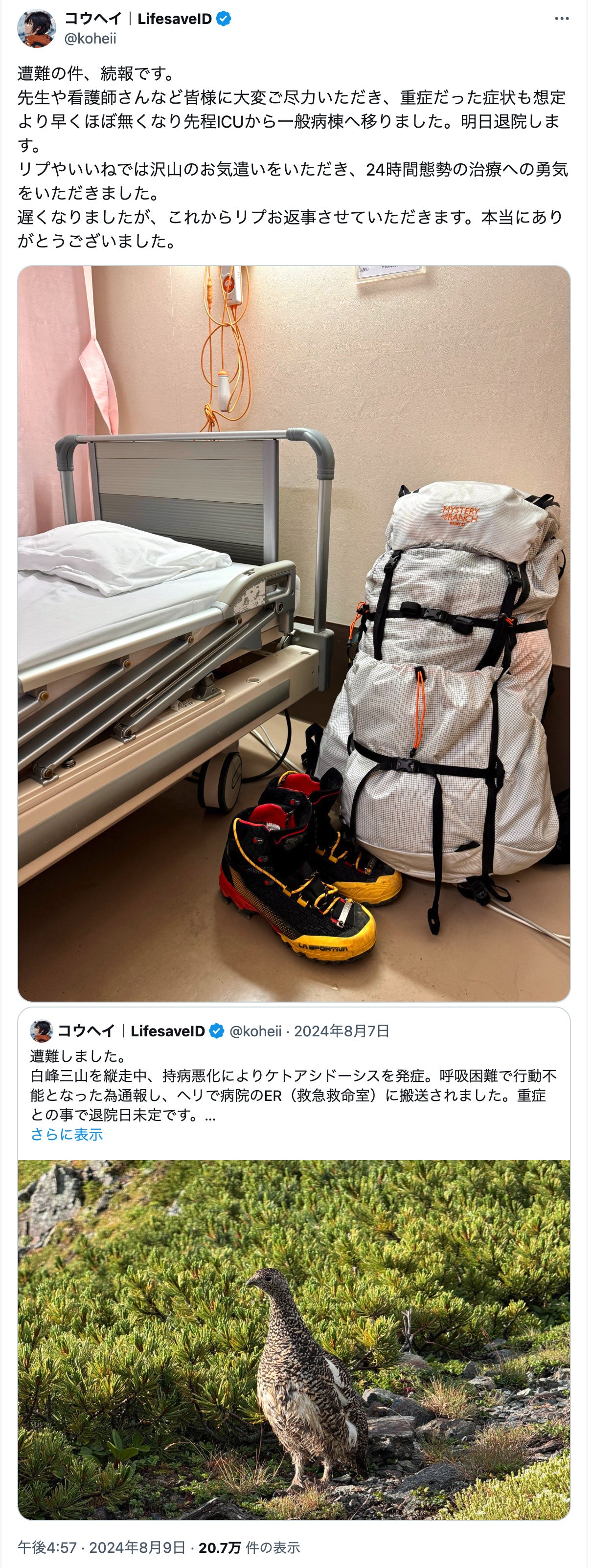 そして、ヘリでの搬送に関わって下さった警察の皆様や搬送先病院の医療関係者の皆様など、本当に多くの方に大変なご尽力をいただき、無事退院できました。