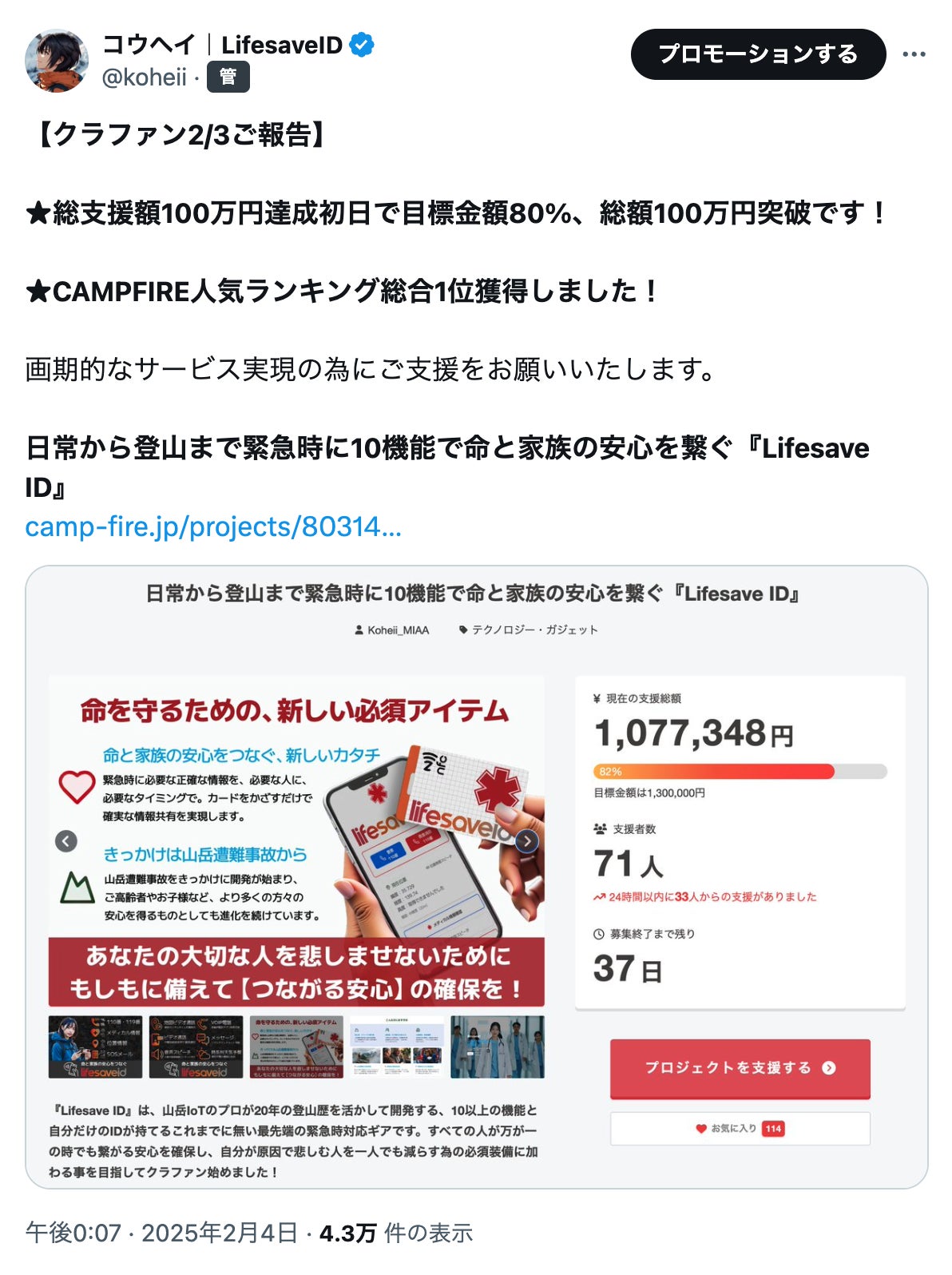 そこで見えてきたのがクラウドファンディングの活用です。このLifesaveIDの可能性や価値に期待して下さる方がどれくらいいるのか正直不安もありましたが、残された道はそれしかありませんでした。