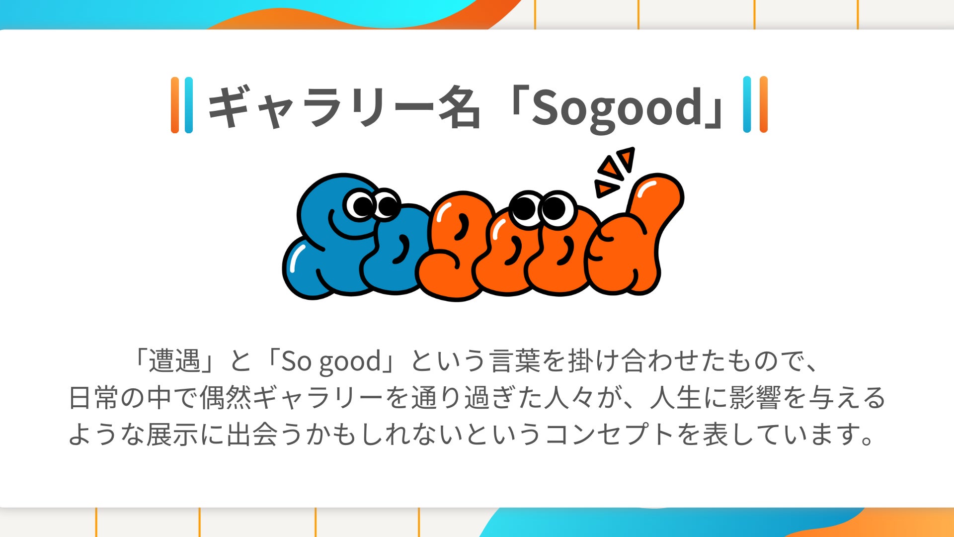 今回オープンするギャラリー名は「Sogood」です。これは、偶然出会うという意味の「遭遇」と素晴らしいという意味の「So good」を掛け合わせたものです。