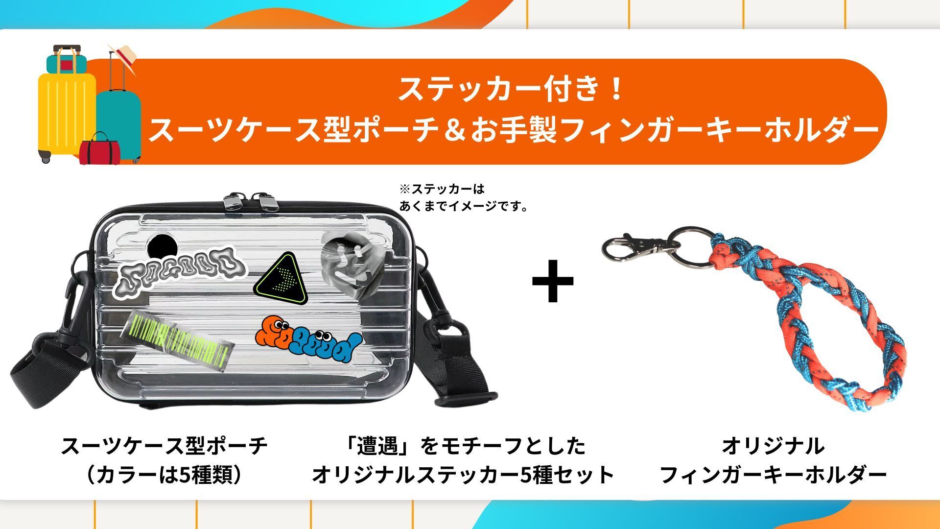 →旅に持っていきたくなるスーツケース型ポーチにオリジナルステッカー5枚を貼ったセットです!