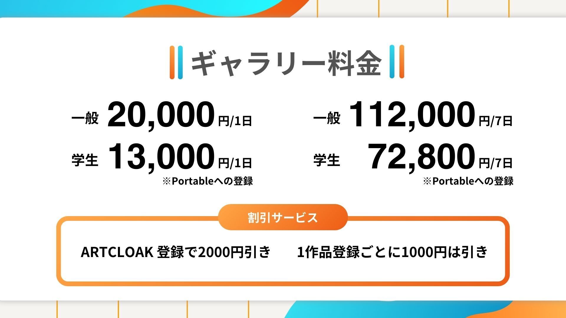 例えば、学生3人でグループ展を7日間開催し、一人が5作品を展示する場合、学生の料金72,800円に対して、2,000円×3人+1,000円×5作品×3人=21,000円を割引いたします。