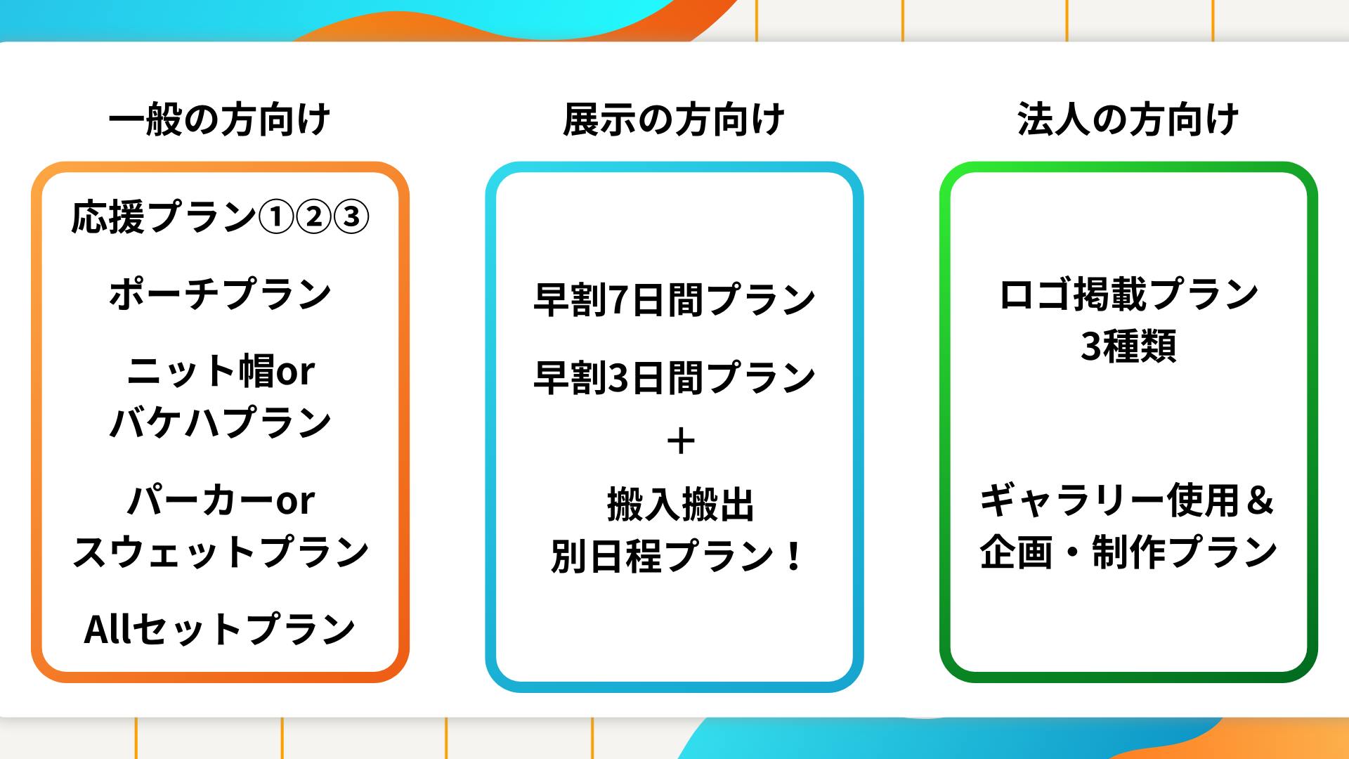 今回は、一般の方向け・展示の方向け・法人の方向けといくつかプランを用意させて頂いております。
