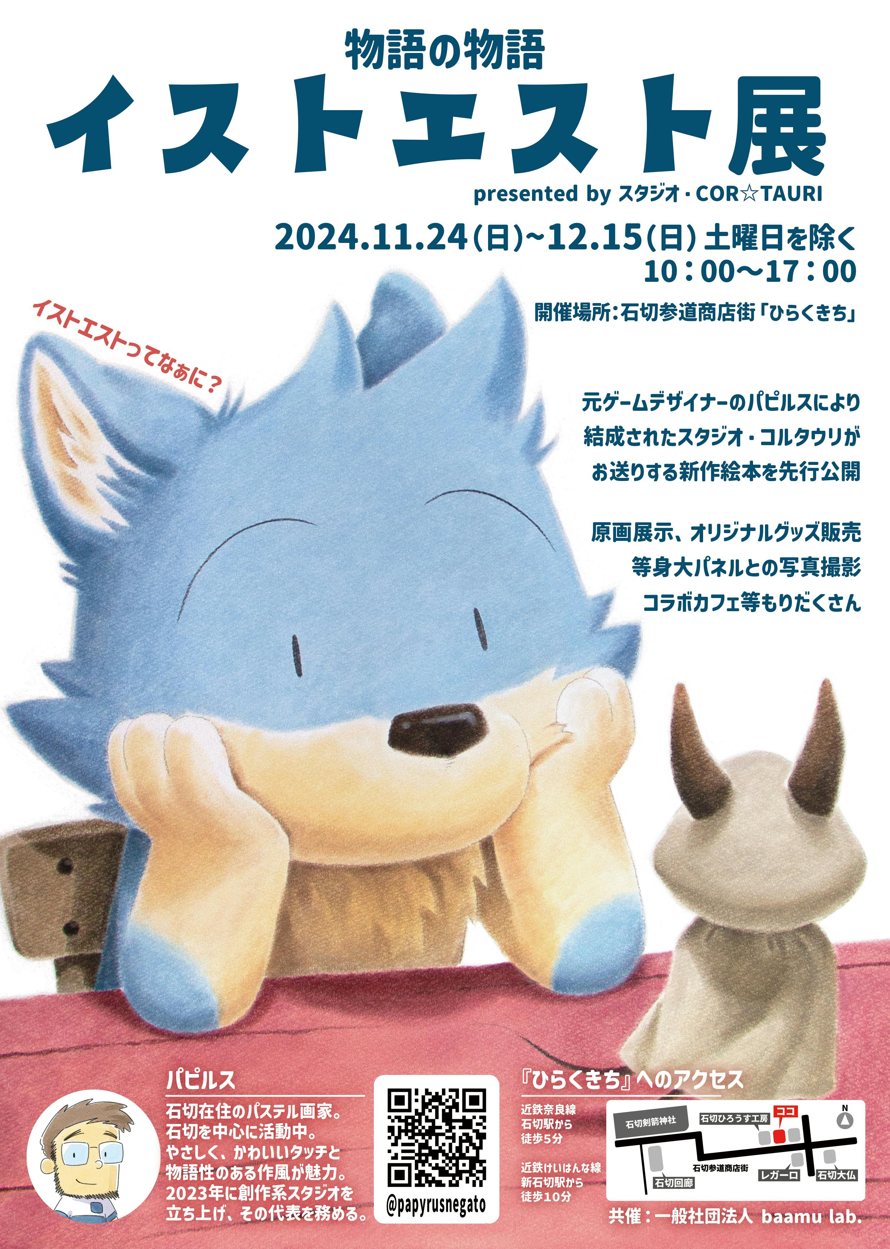 東大阪市石切で運営しているギャラリー「ひらくきち」で開催する、地元アーティスト・パピルスの新作絵本『イストエスト物語』の先行公開と原画展を盛り上げることを目的とします。2024年11月24日〜12月15日に開催の個展では物語の世界を地域の皆さんと共有し楽しめるようグッズ販売・コラボカフェも行います。