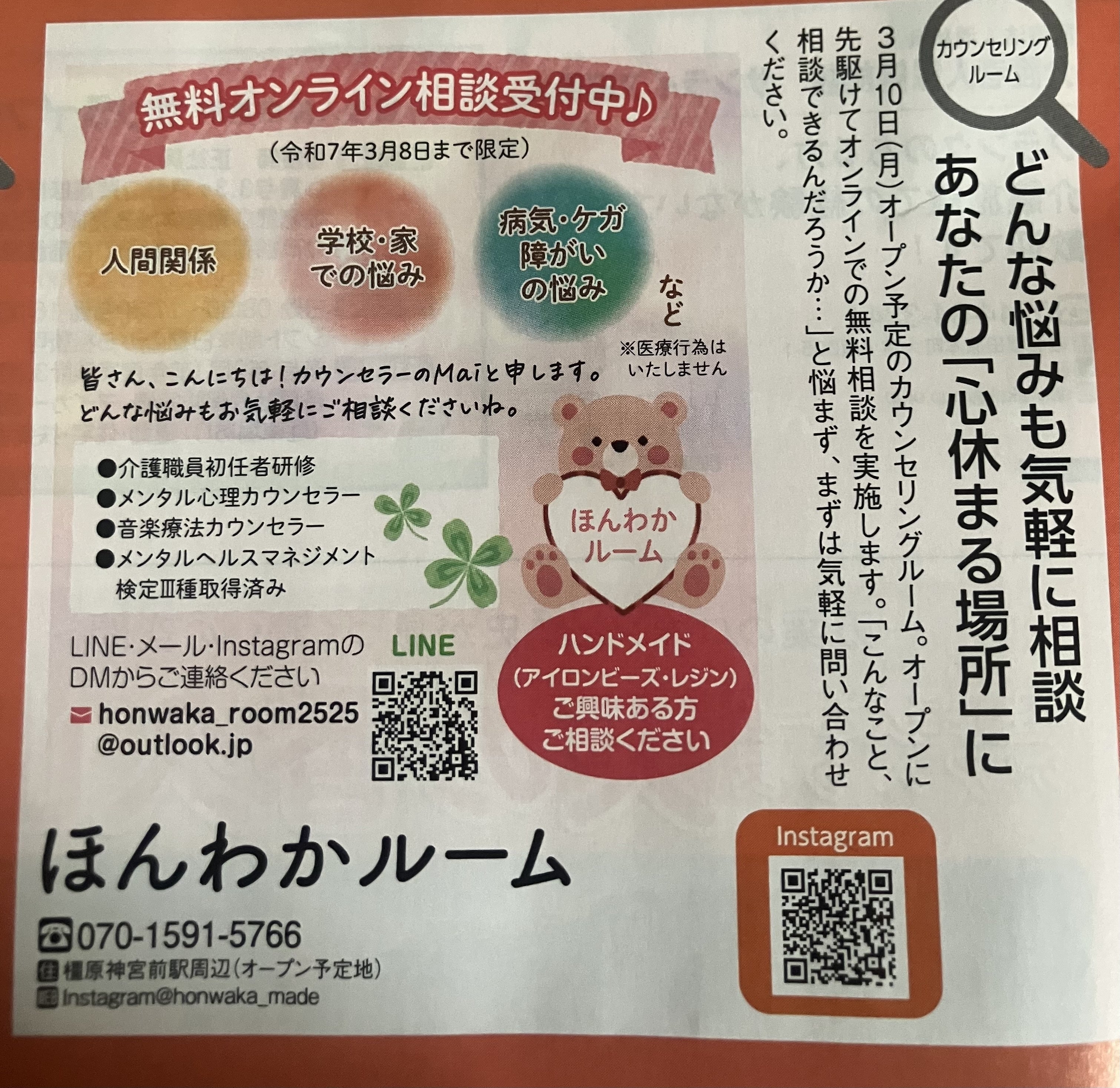 2024/10/31 07:27みなさんこんにちは(*^^*)この度、地元広報誌である“かしるくらぶ”さんにご掲載いただきました!かしるくらぶさんありがとうございます(^^)初回無料でカウンセリング承っておりますので、ご興味ある方は是非ご連絡ください。よろしくお願いします!まだまだご支援お待ちしているので、ほんの少しでもいいのでご協力いただけたら幸いです。最後までお読みいただきありがとうございました♪ もっと見る