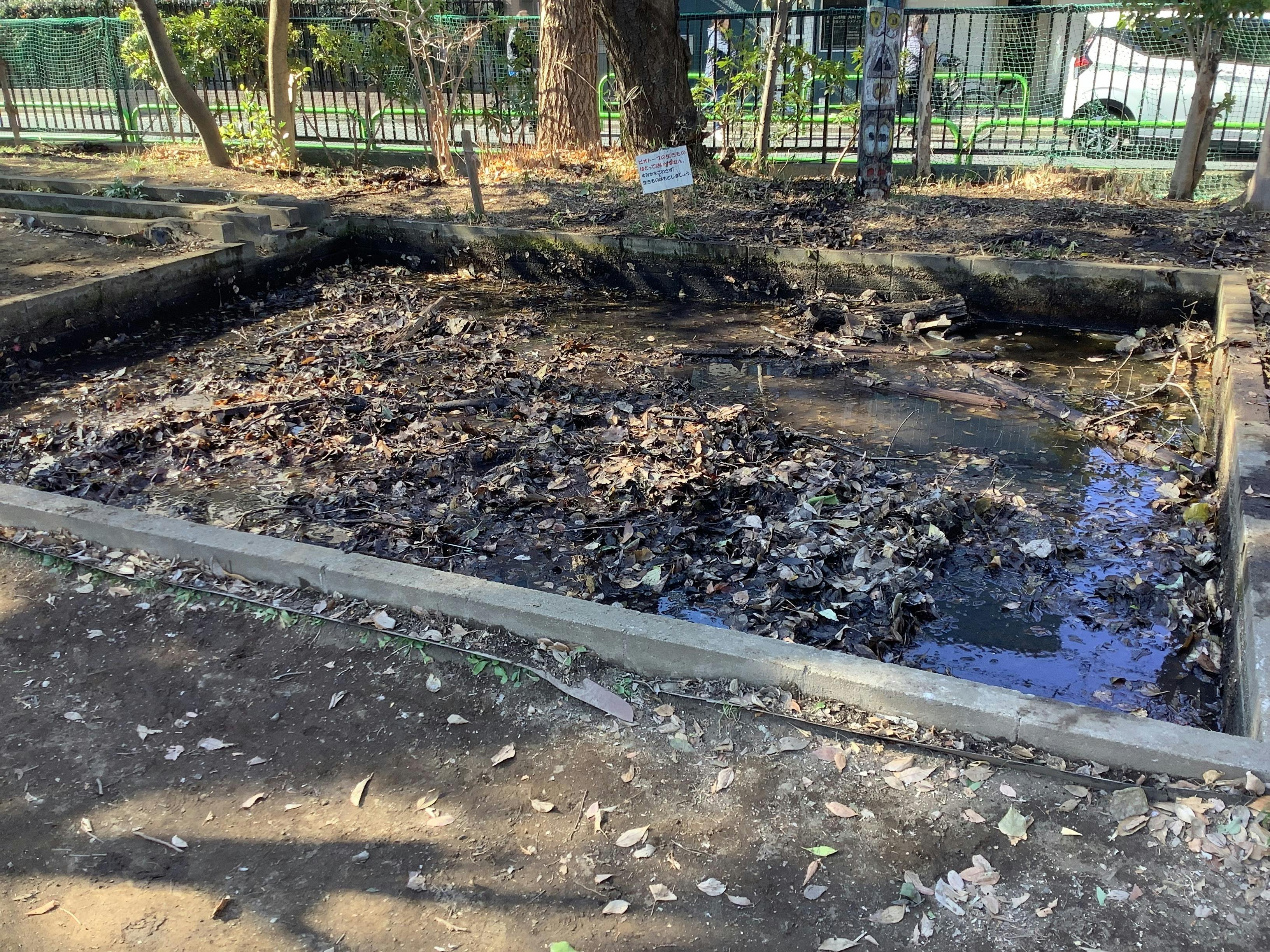 これまで、少しずつビオトープ池の水を抜いていき、ここまで水を減らすことができました。
