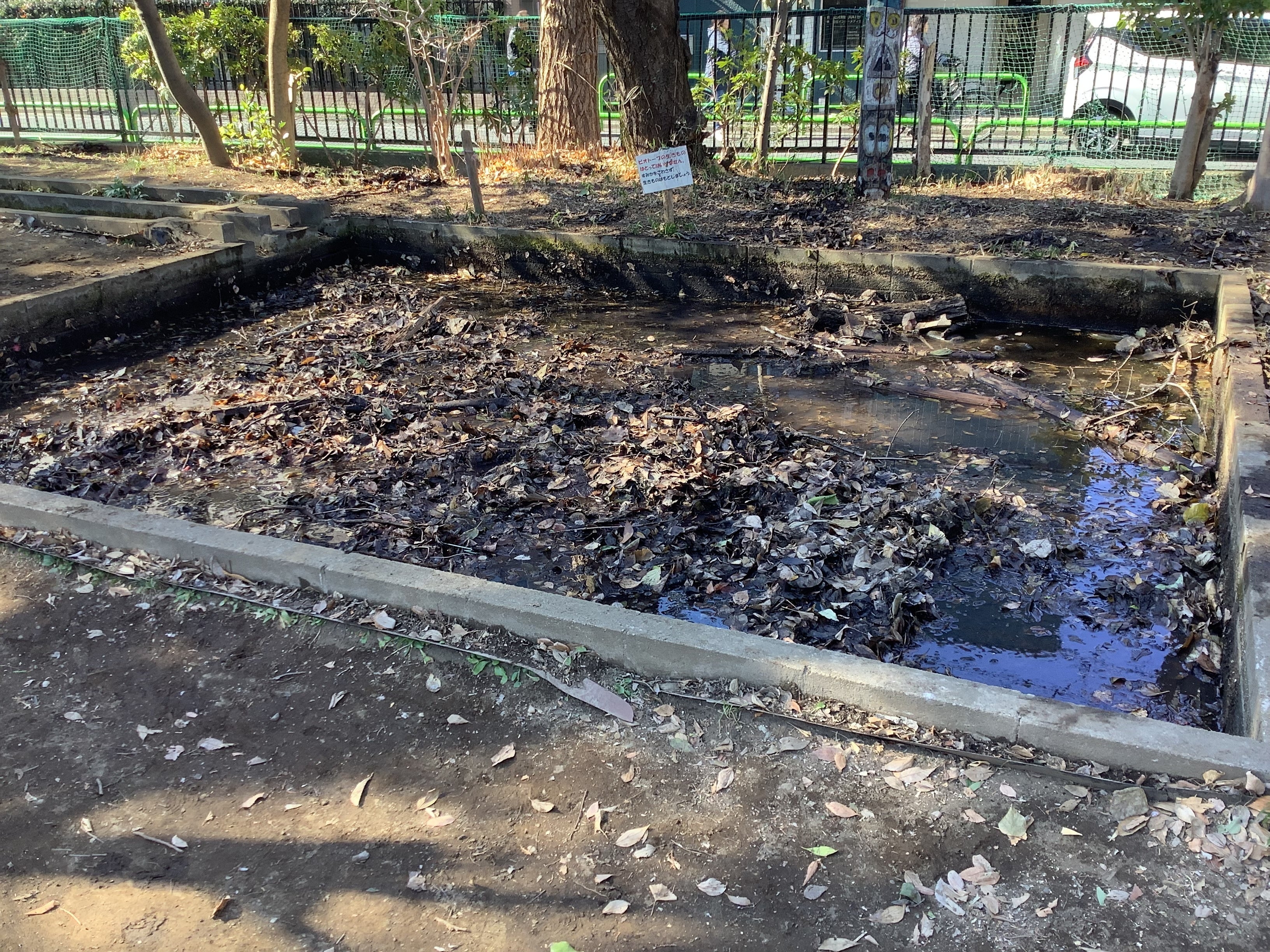 これまで、少しずつビオトープ池の水を抜いていき、ここまで水を減らすことができました。これから、中の落ち葉やゴミを除去していきます。