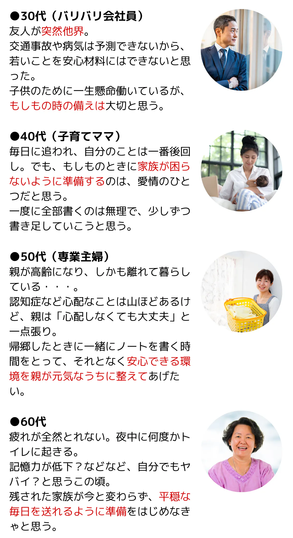 忙しい日々の中でも、あなたの想いをしっかりと残しておくことができ、家族への安心とつながりを築くためのありそうでなかったかけがえのないノートなのです。