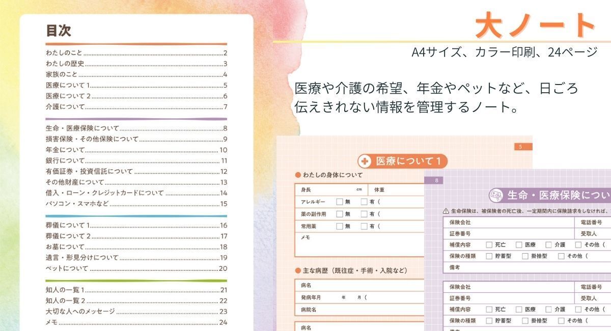 忙しい日々の中でも、あなたの想いをしっかりと残しておくことができ、家族への安心とつながりを築くためのありそうでなかったかけがえのないノートなのです。