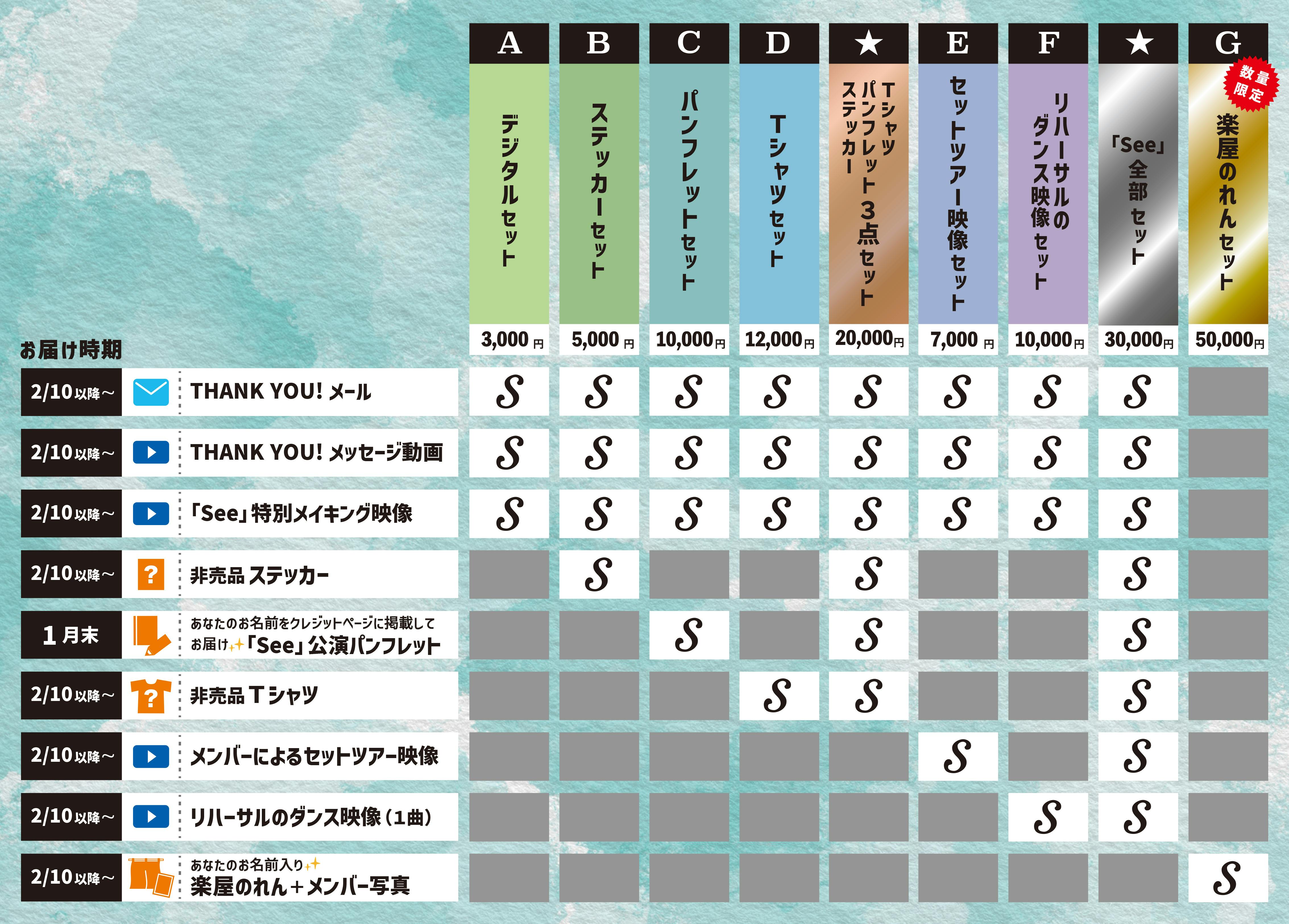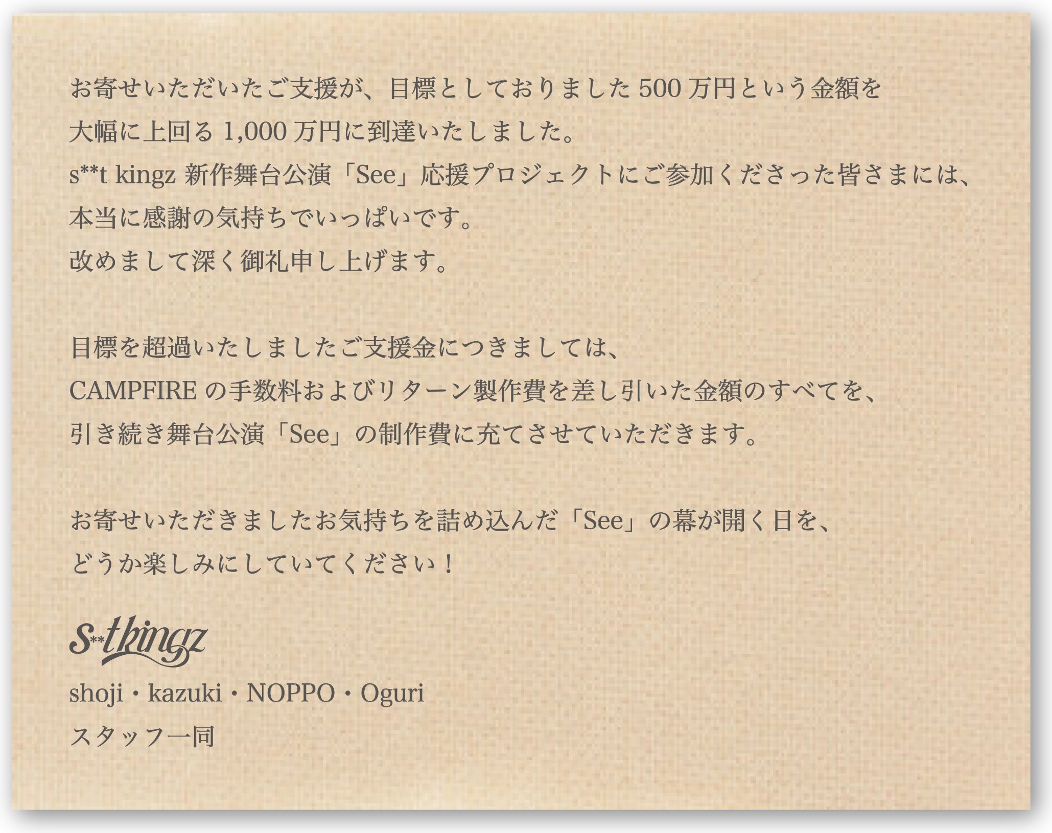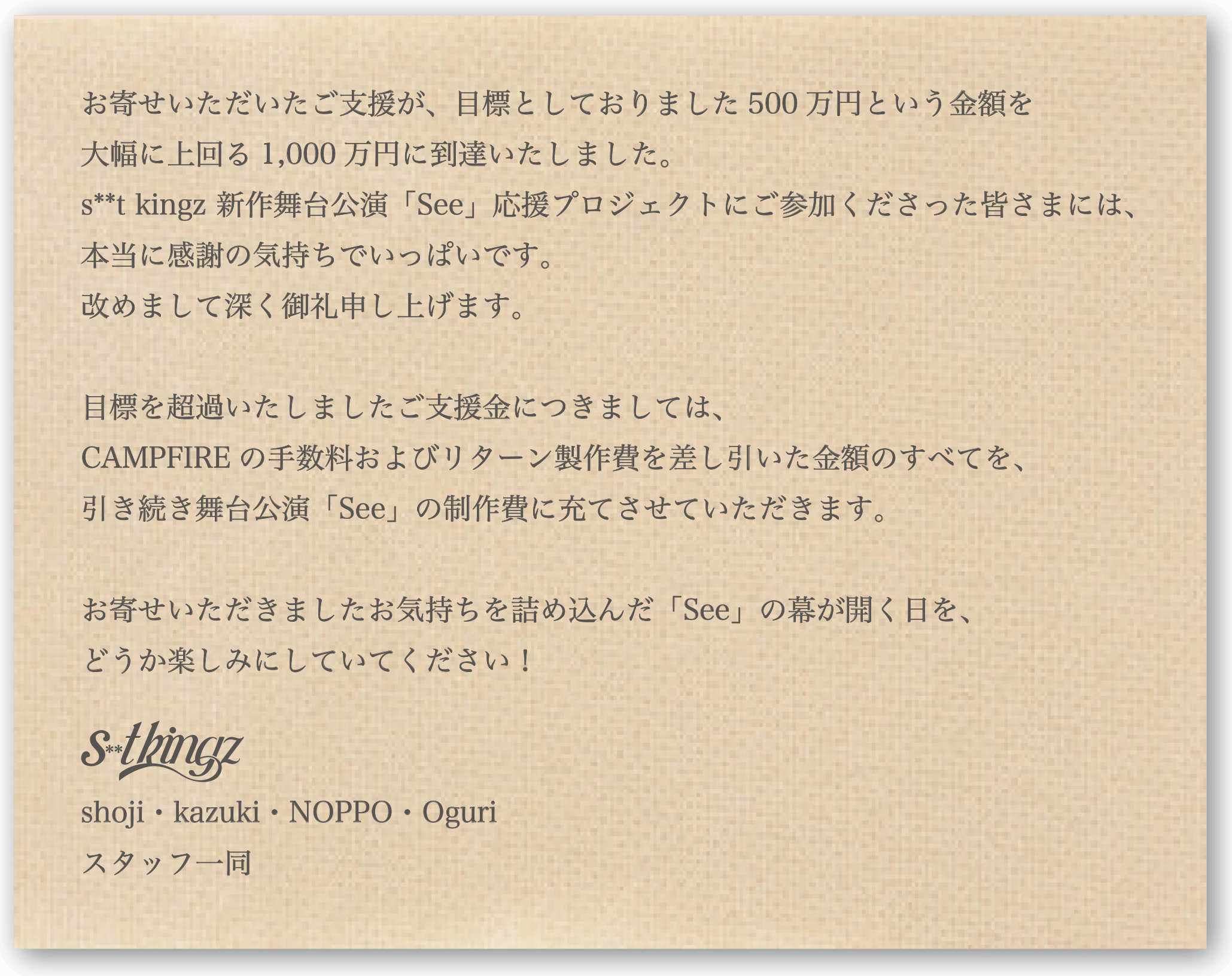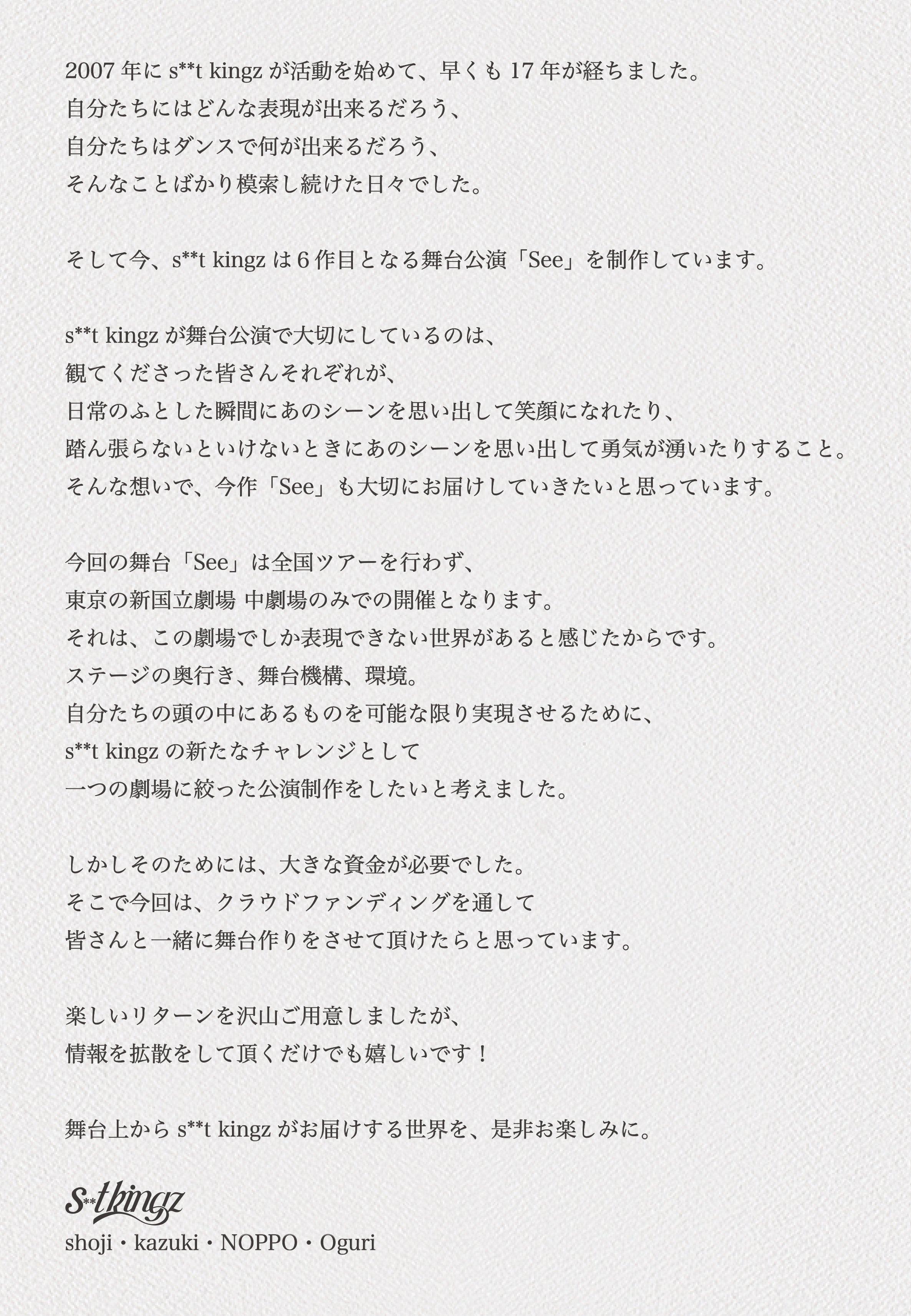 2025/02/27 14:00この度は、s**t kingz 新作舞台公演「See」応援プロジェクトに温かいお気持ちをお寄せいただきまして誠にありがとうございました!!2月9日をもちまして全公演が無事に閉幕いたしました。これもひとえにご支援あってのことと、改めまして深く御礼申し上げます。リターンは、2025年2月25日にすべての発送が完了しております。万一未着等お気付きの点がございましたら、メッセージ機能からお問い合わせくださいませ。【お問い合わせ受付期限】2025年3月31日まで重ねてとなりますが、この度はたくさんのご支援を本当にありがとうございました!感謝を込めて!!s**t kingz・スタッフ一同 もっと見る新年明けましておめでとうございます!
