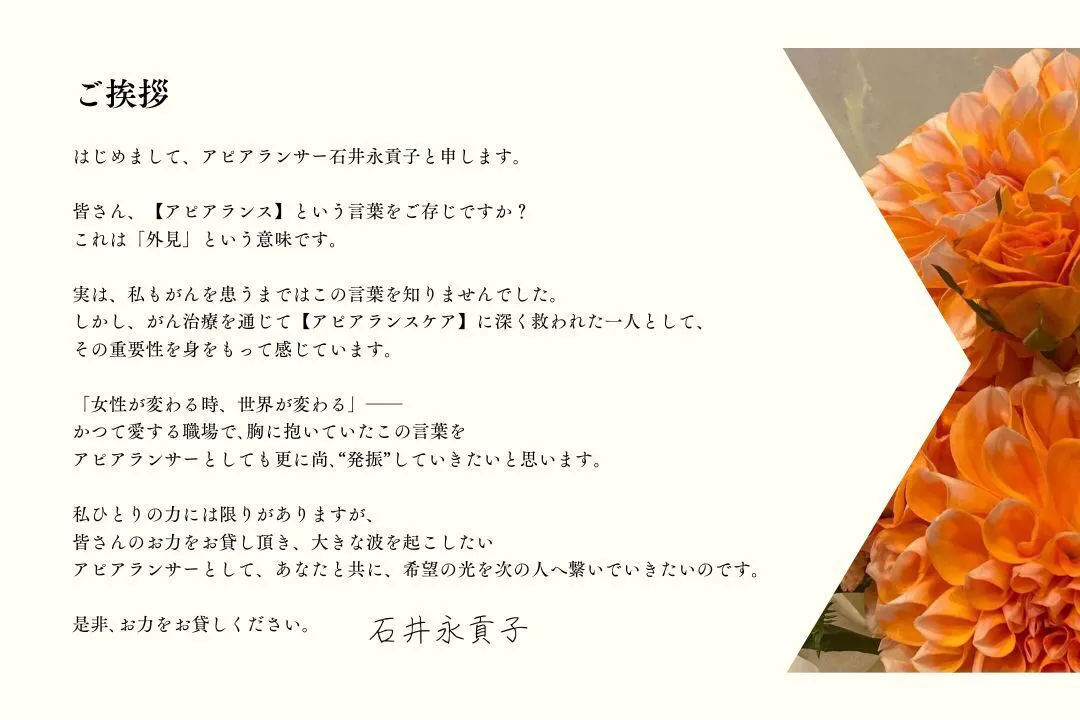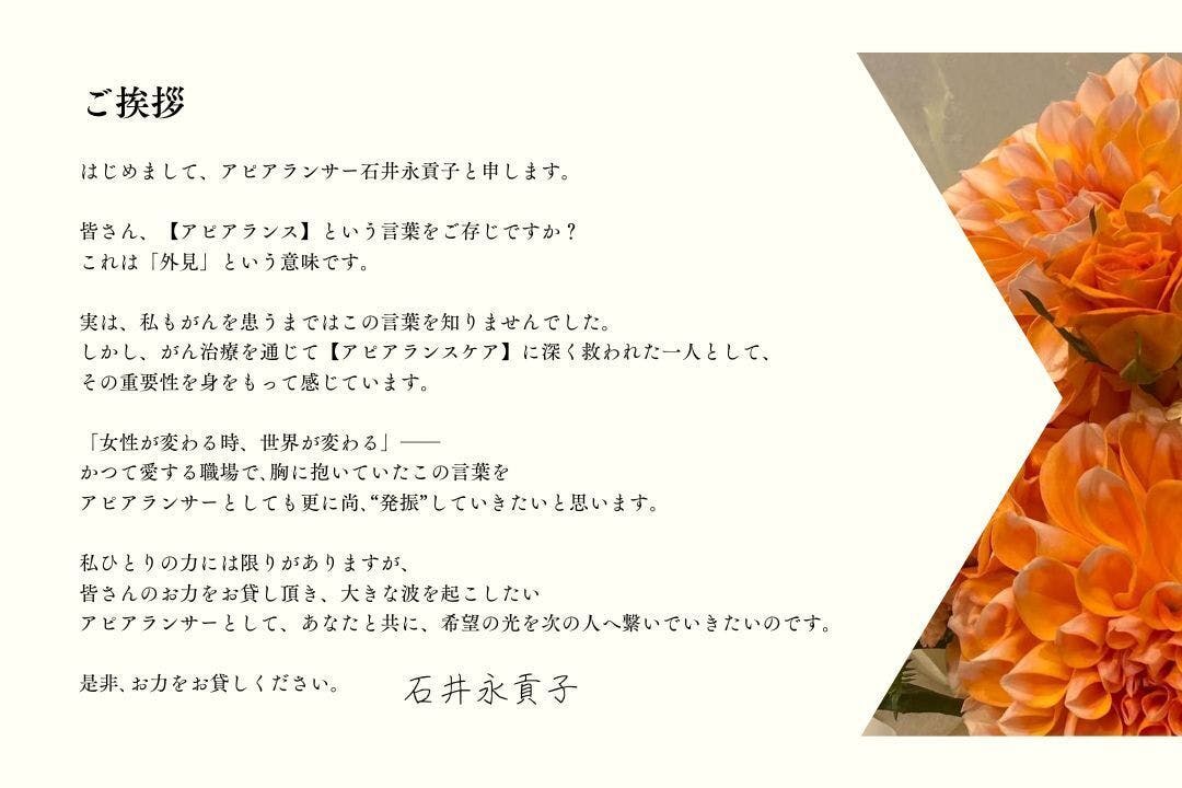 私、石井永貢子がアピアランサーとして、活動するにあたっての経緯、これからの展望をお伝えする中で、皆さんの大切な人を救えるキッカケになればと思い、クラウドファンディングをスタートすることに致しました。