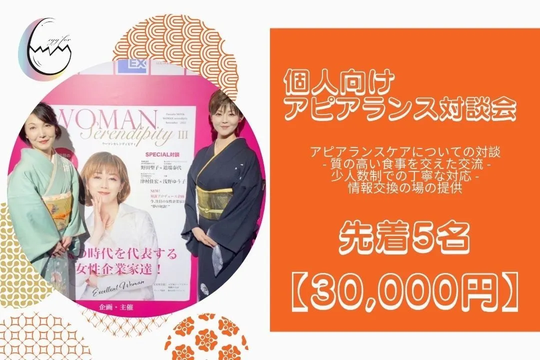 - 上質な会場での特別な対談会/アピアランサーとしての想いを共有/質の高い会席料理付き/心温まる交流の時間