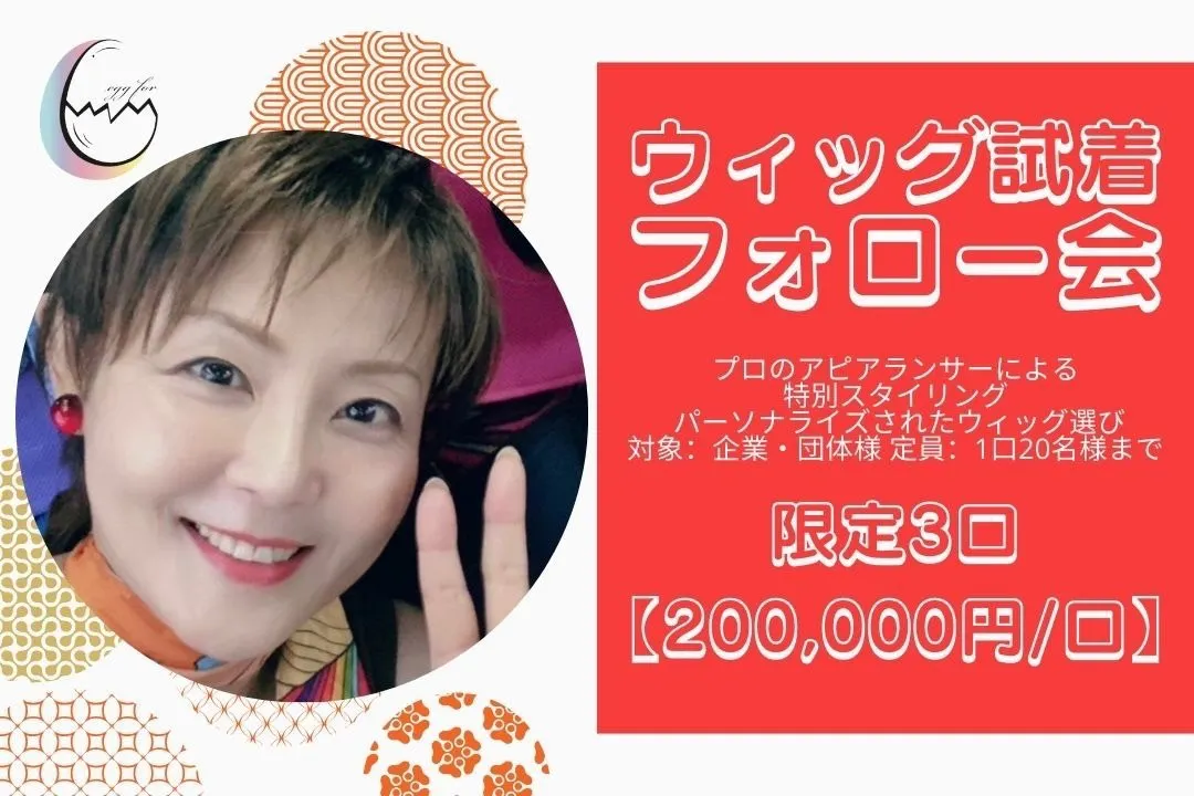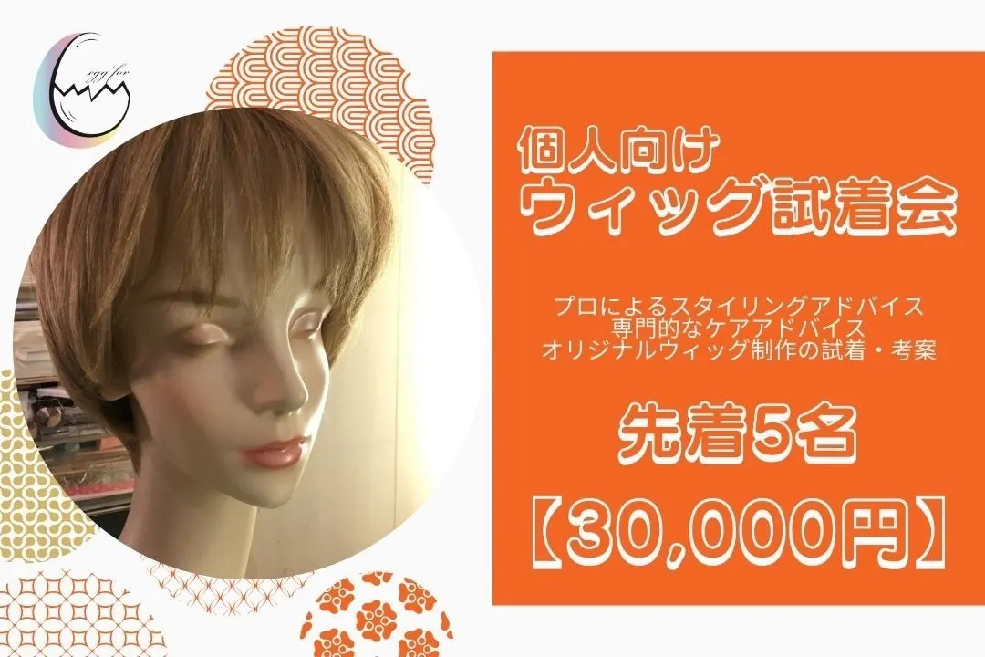 アピアランサー石井永貢子による個人向けウィッグ試着会、あなたにあったウィッグ選定に必要なヒアリングをし、オススメするウィッグの紹介から実際にお手元に届いた後の試着フォローからスタイリングまでサポート致します。