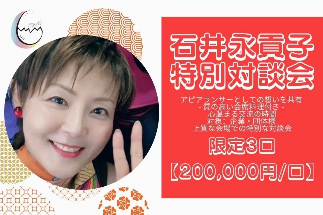 こんな方にオススメ:永貢子さんとゆっくりとお話しされたい方/永貢子さんの想いに共感してくださる方/普段聞けない永貢子マル秘エピソードをお聞きしたい方/永貢子さんと一緒に御朱印巡りに行きたい方/永貢子さんと一緒に懐石料理を食べに行きたい方
