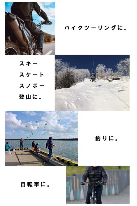 いろんなシーンで活躍するのが8秒即暖アウターバイクツーリングスキー スケートスノボー登山釣り自転車いろんなシーンでお使いください!広報担当 平一平
