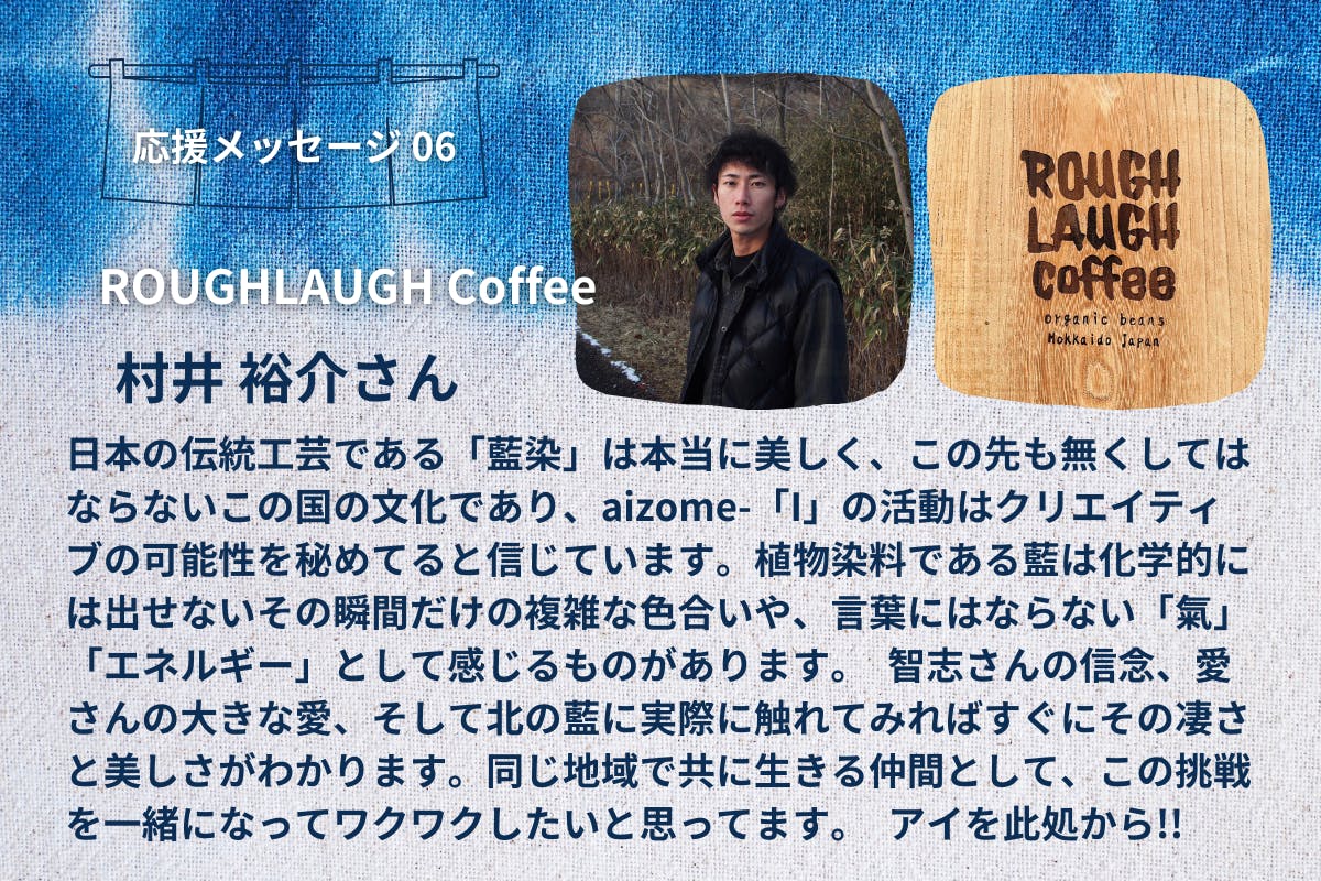 僕の想いや考えに賛同してくださる方、藍染めが好きな方、楽しそう!面白そう!と思ってくださる方、伊達を盛り上げたいと思ってくださる方、プロジェクト成功のためにどうぞ力を貸してください!
