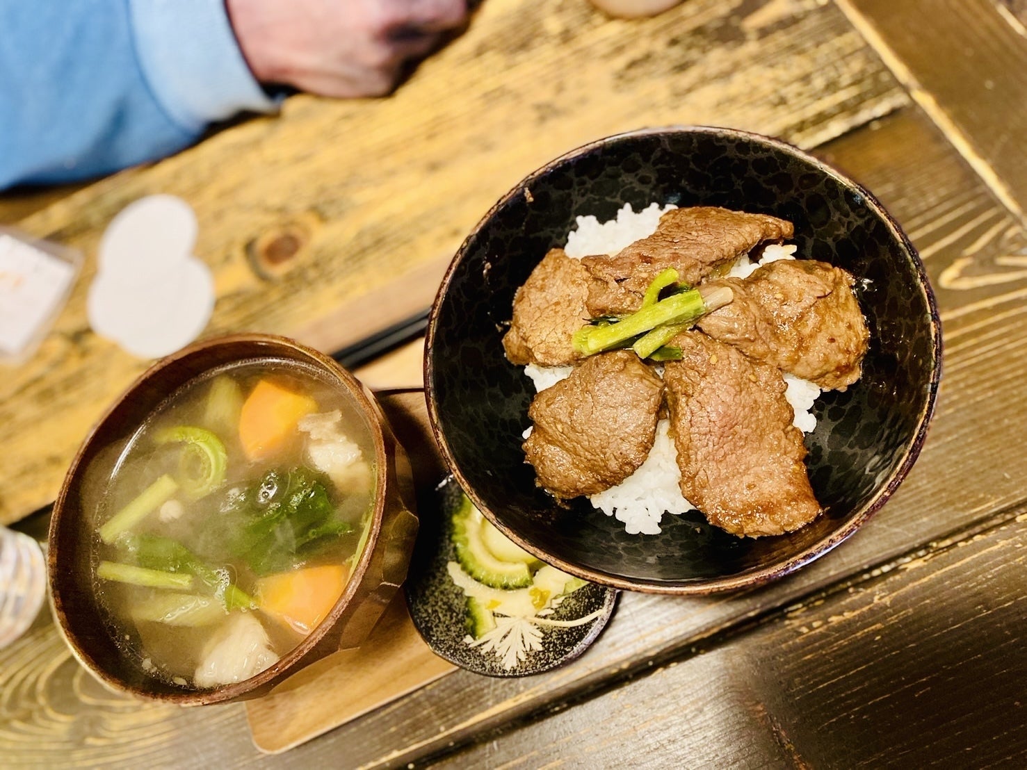 タレに漬け込んだ鹿肉(ユク)がのった丼。てっぺんにはキトピロ(アイヌネギ:行者ニンニクです)ものっていました。