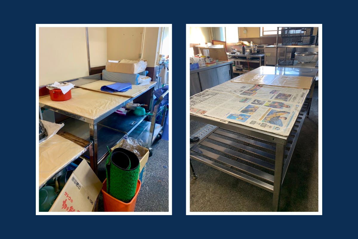 シンクやテーブルは、長年学校給食の仕事をなさっていたご夫婦が引退されるとのことで、藍染めで新たな活路を見出すべく、2年前から藍の研究を共にしている室蘭工業大学の馬渡教授からお話をいただき、譲り受けることとなりました。