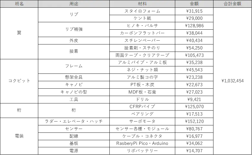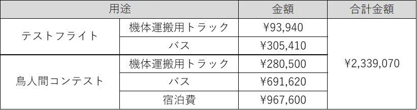 今年度、鳥人間コンテスト出場までに要した金額は1,032,454円です。