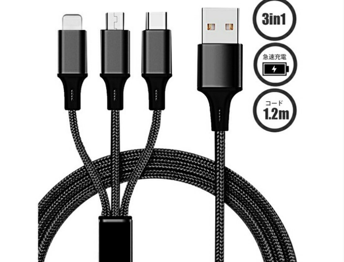 lightng,micro,type-Cに対応している3in1のUSBケーブルを付属。