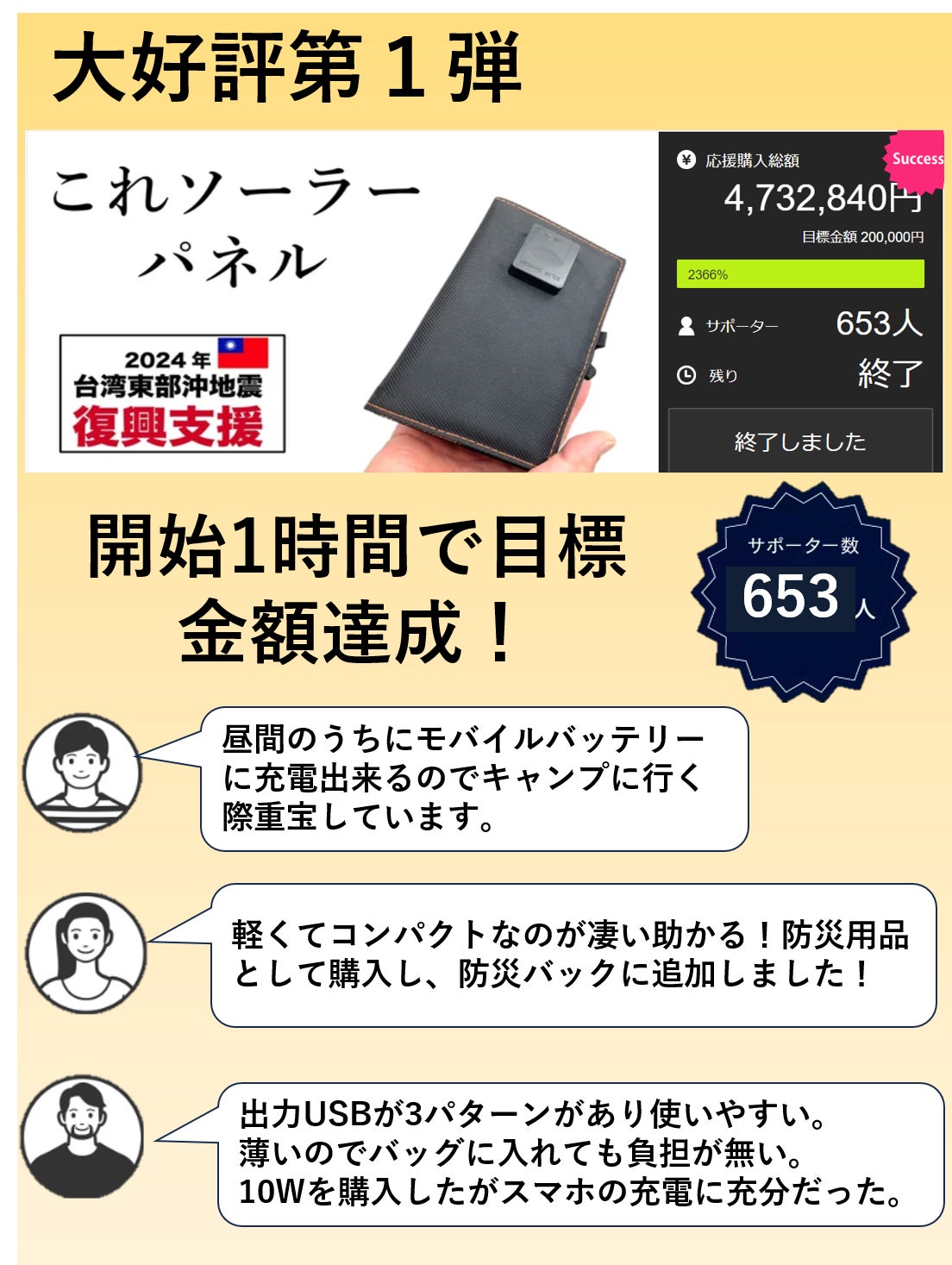 キャンプや日常生活で、充電が残っていなく、あ!?ということは皆様にも思い当たると思います。そういう時のために持っていると助かるコンパクトなソーラーパネルを多くの皆様に紹介したいと思いました。アウトドアや災害時にあると大変便利な商品です。ぜひ皆様のご支援お待ちしております。