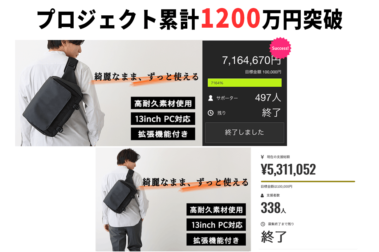 先に実施したTOUGH BIG SLING BAGのブラック限定プロジェクトでは、machi-yaやMakuakeで予想をはるかに超える沢山の方からご支援を頂き、合計1,200万円を超える先行購入をいただきました。