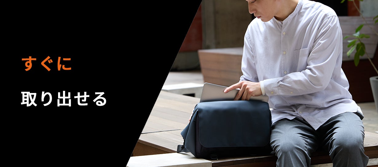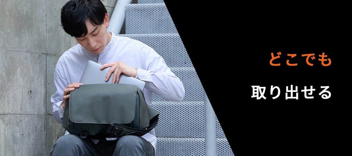 スリングバッグがPCに対応することで、気軽にPCを持ち出せます。